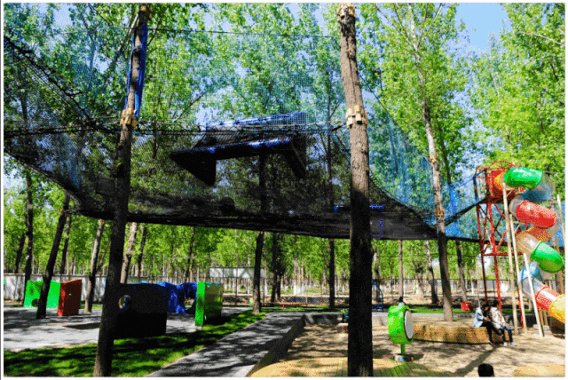 在绿树与网绳交织的森林童话乐园中