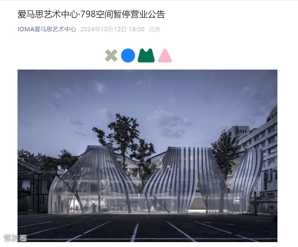 798爱马思艺术中心官宣关闭了,爱马思是2019年入驻798艺术区的,下半年开馆。地段算核心,占据同心广场一半建筑面积。另一半是旁边的“百雅轩”荒了好多年的“旧址”。爱马思的建筑改造是花了很大心思和精力的,视觉不错。现在官方已经发布消息,暂停营业了。#酒仙桥新鲜事#酒仙桥随手拍#酒仙桥#798艺术区#闭店