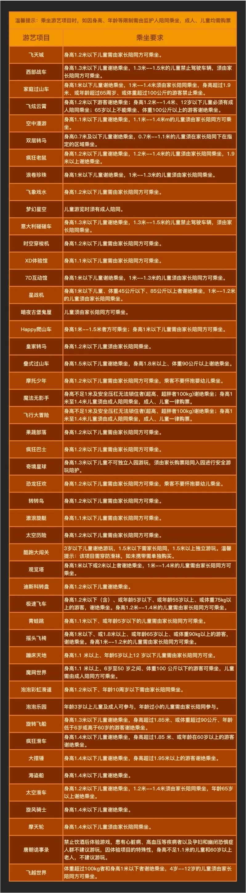 7、部分项目有身高限制,请参照项目乘坐须知,项目乘坐须知详见顶部图片,如需家长陪同,陪同人员需购票后方可乘坐。