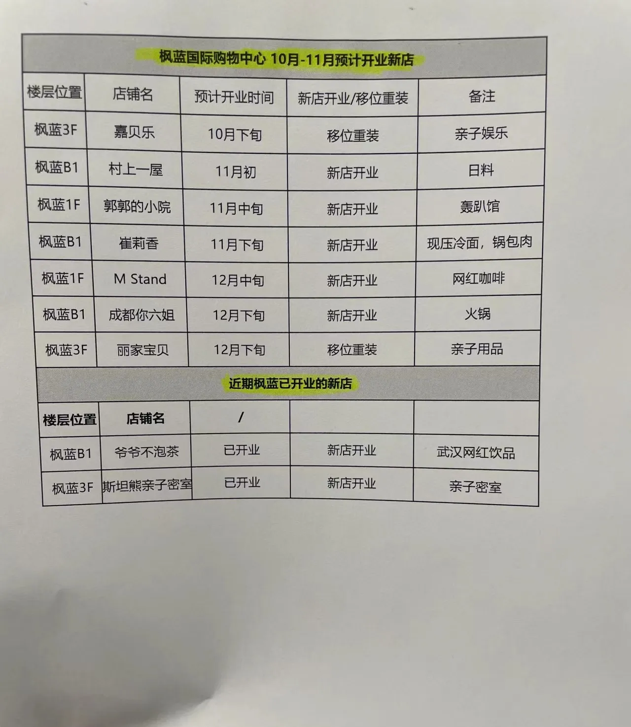 枫蓝国际购物中心近期开业的新店信息