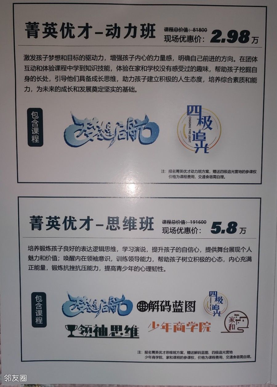 因孩子当时不是很愿意报名,老师跟我们承诺即使交费后,如孩子到时候不愿意参加活动,可以全额退费,家长也没有损失。在老师的说服下,我们10月6日缴纳了“菁英优才-思维班”课程培训费总共5.8万元,包括:梦想启航、领袖思维、解码蓝图、少年商学院、四极追光、家和共6个板块的课程。