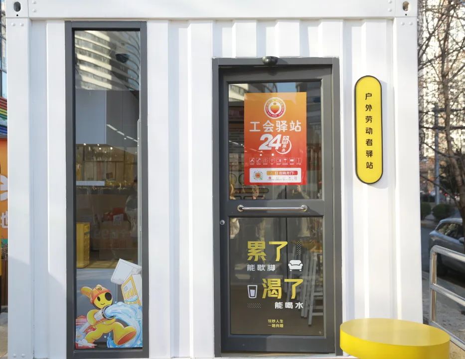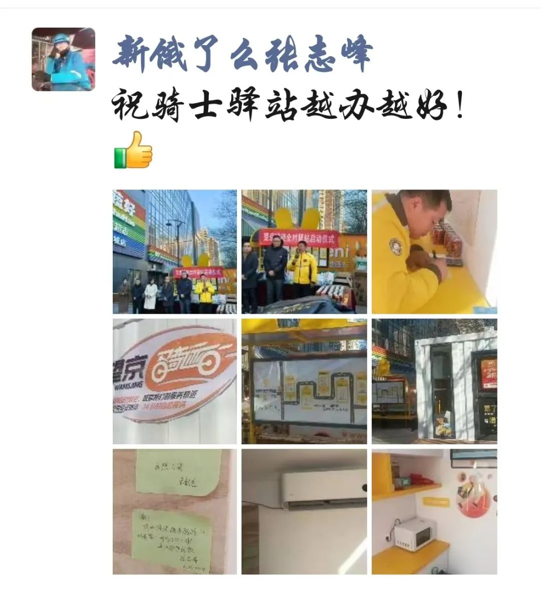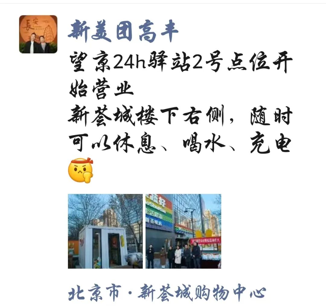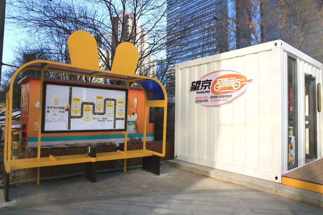 这是望京街道党工委响应骑手友好商圈暖“新”行动,与美团党委、新荟城物业共同为骑手们精心打造的全时驿站,也是继望京小街骑迹驿站之后的第二座商圈24小时智能化骑迹驿站。