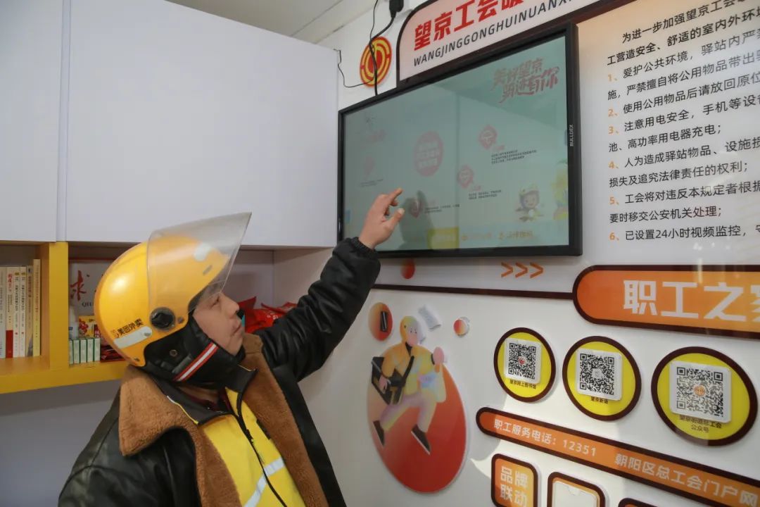 驿站24小时提供智能服务,设置智能感应门,自动门禁,每日早8点到晚8点期间可自动开门,晚8点到早8点期间扫描二维码登记信息即可进入。街道设置“美好望京,骑迹有你”智能交互导航智慧屏,将望京辖区暖心驿站阵地导引图、便民服务导引图、企业服务导引图汇集在智慧屏中,以手绘形式呈现,方便骑手随时查询。