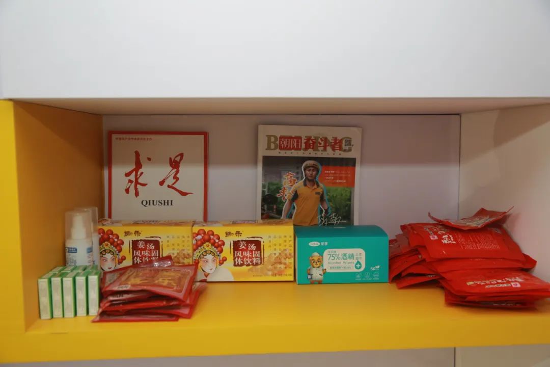 新荟城望京骑迹驿站内部面积约10平方米,外部休息区、活动区面积约50平方米。小小的空间内设有读书区、充电区、免费饮水区等功能分区,空调长时间开放,不仅有微波炉、血压计、药箱,还准备了姜茶、酒精、湿巾、暖贴等常用物资,为小哥提供“触手可及”的便利。