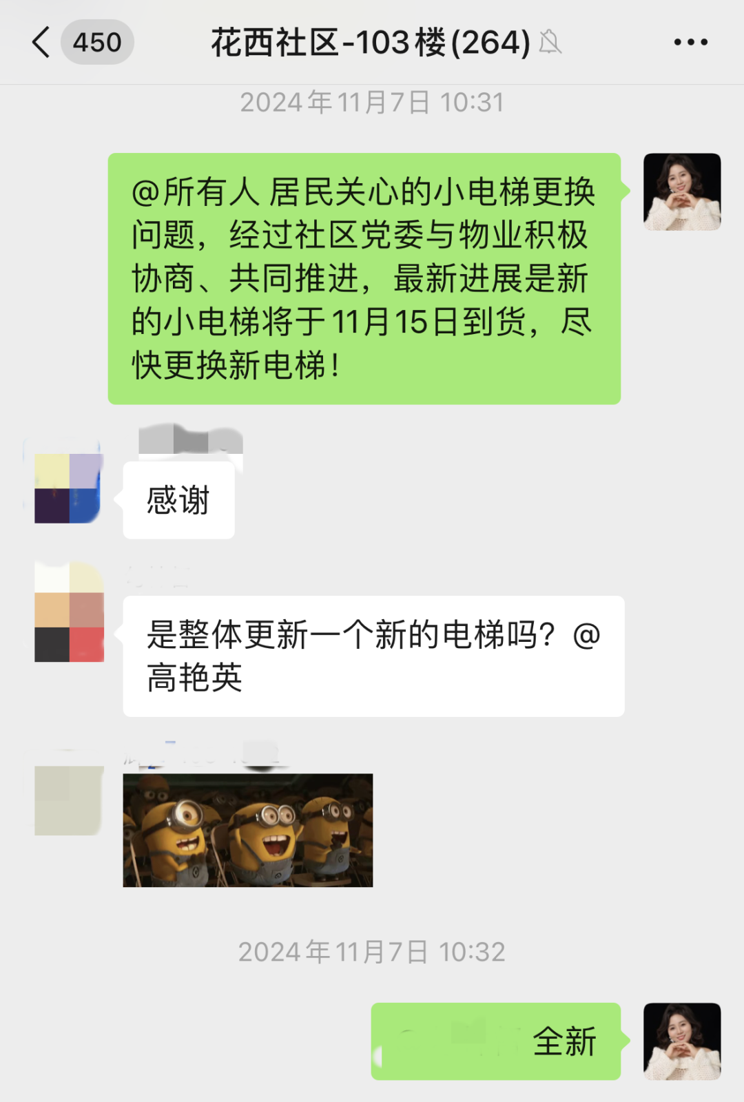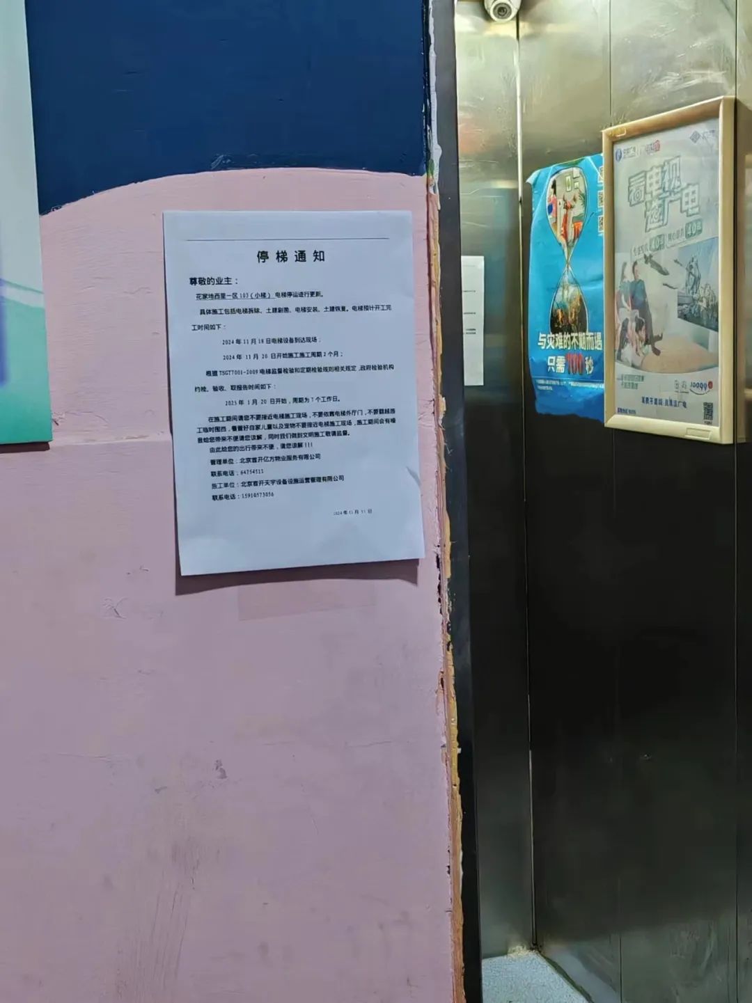 2024年11月15日,电梯设备到货。在小电梯拆卸更换之前,为确保施工期间,另一部大电梯正常运行且尽可能满足楼内居民的出行需要,社区党委要求维保公司对大电梯进行了系统的维护。同时,社区工作人员在群内发布停梯通知,在楼门、单元门等处张贴告示。