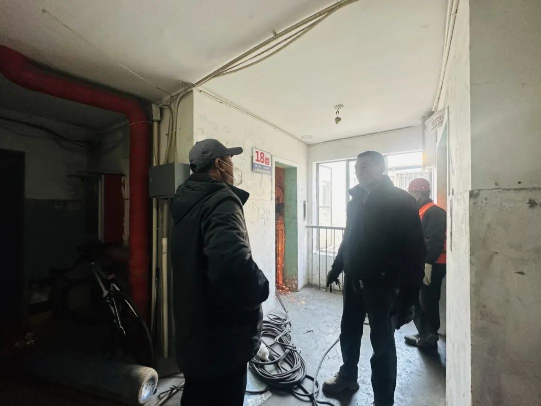 小电梯施工过程中,社区工作人员时刻关注大电梯的运行情况,以便及时获取并解决故障。一日夜间,有居民反映大电梯发生了故障,为不影响居民第二天一早出行,社区党委书记张广山一层一层爬到顶楼,来回逐层检查了三次,并联系物业维修人员排查故障原因,最终确认是某一层有水流入了电梯,造成传感器停电导致停梯。随后,张广山与物业人员用吹风机将水吹干后,电梯恢复正常运行。