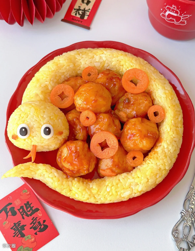 有手就会的新年氛围感美食!蛇来运转! 0失败❗0失败❗米饭裹上保鲜膜搓成长条,就是可爱的小蛇盘成一个圈,里面放上爱吃的菜!一下子氛围感就拉满了