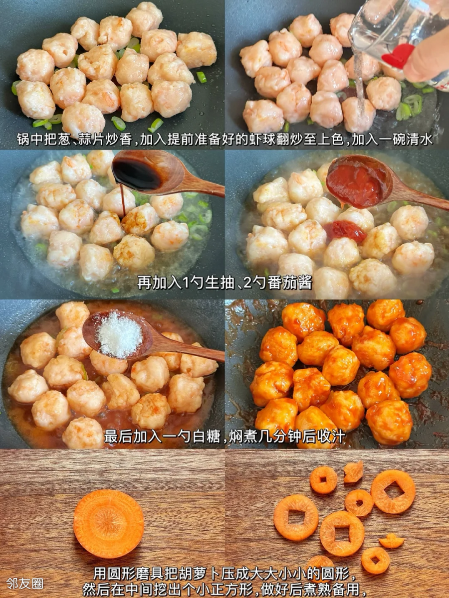 制作步骤: 1. 锅中把葱、蒜片炒香,加入提前准备好的虾球翻炒至上色,加入一碗清水 2. 再加入1勺生抽、2勺番茄酱,最后加入一勺白糖,焖煮几分钟后收汁