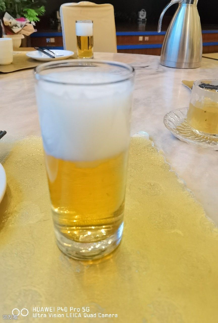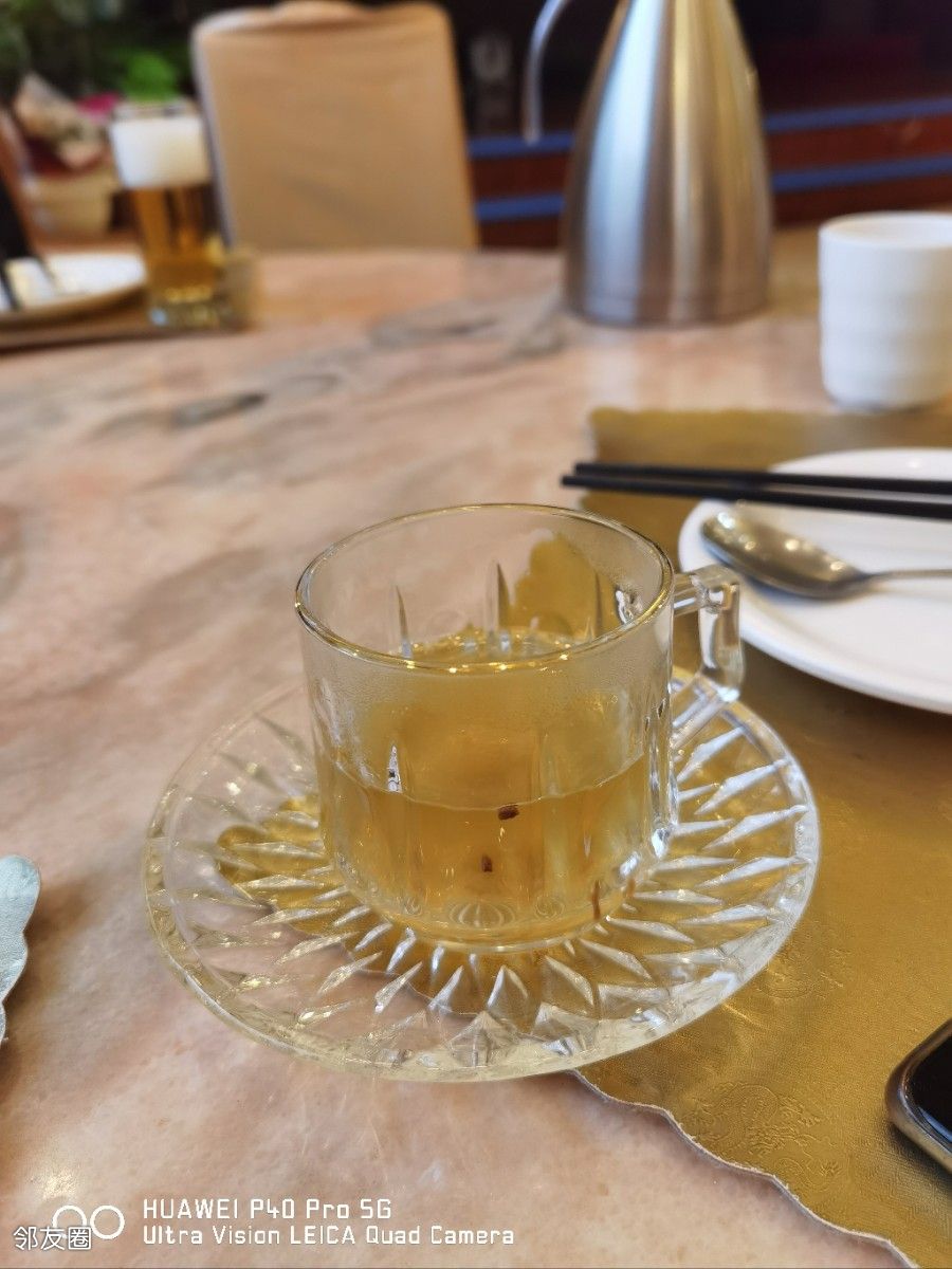 服务员介绍说大同江啤酒和姜茶都是从朝鲜带来的,我们尝一尝。啤酒挺清淡的,挺好喝,姜茶也适合冬天喝。