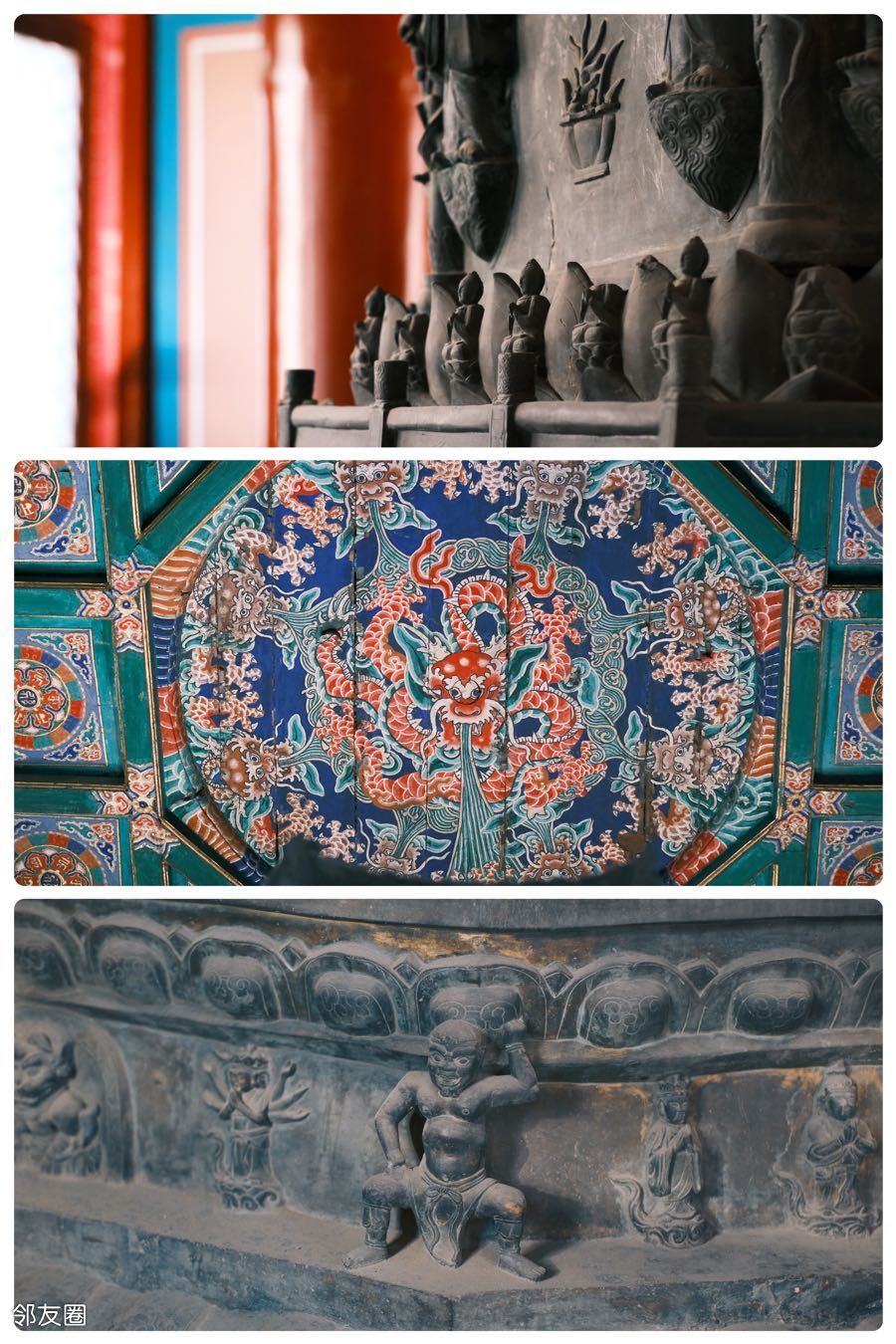 ▫️山门顶之趣 - 拱形的山门穹顶上深蓝色的背景之上是漂浮的祥云和飞翔的蝙蝠,这幅「洪福齐天图」以「蝠」喻「福」,这个谐音梗是祝寿的「好意头」;