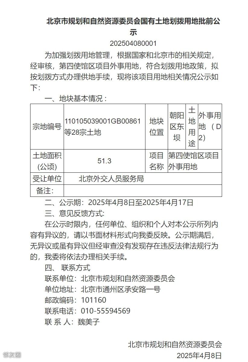 🌍北京第四使馆区新动态!朝阳东坝51.3公顷外事用地划拨公示中!📍地块位置:朝阳区东坝📌宗地编号:110105039001GB00861等28宗土地🏛土地用途:外事用地(D2)📏土地面积:51.3公顷🏢受让单位:北京外交人员服务局✨未来这里将成为第四使馆区的重要外事枢纽,国际范儿拉满!朝阳东坝的发展又要提速啦~ 外交服务局是专门为使馆区建设相关配套的,预测优先建设外交办公楼和外交公寓。 如果顺利的话也会同步移交给外交部,再由各国使馆自行建设本国使馆