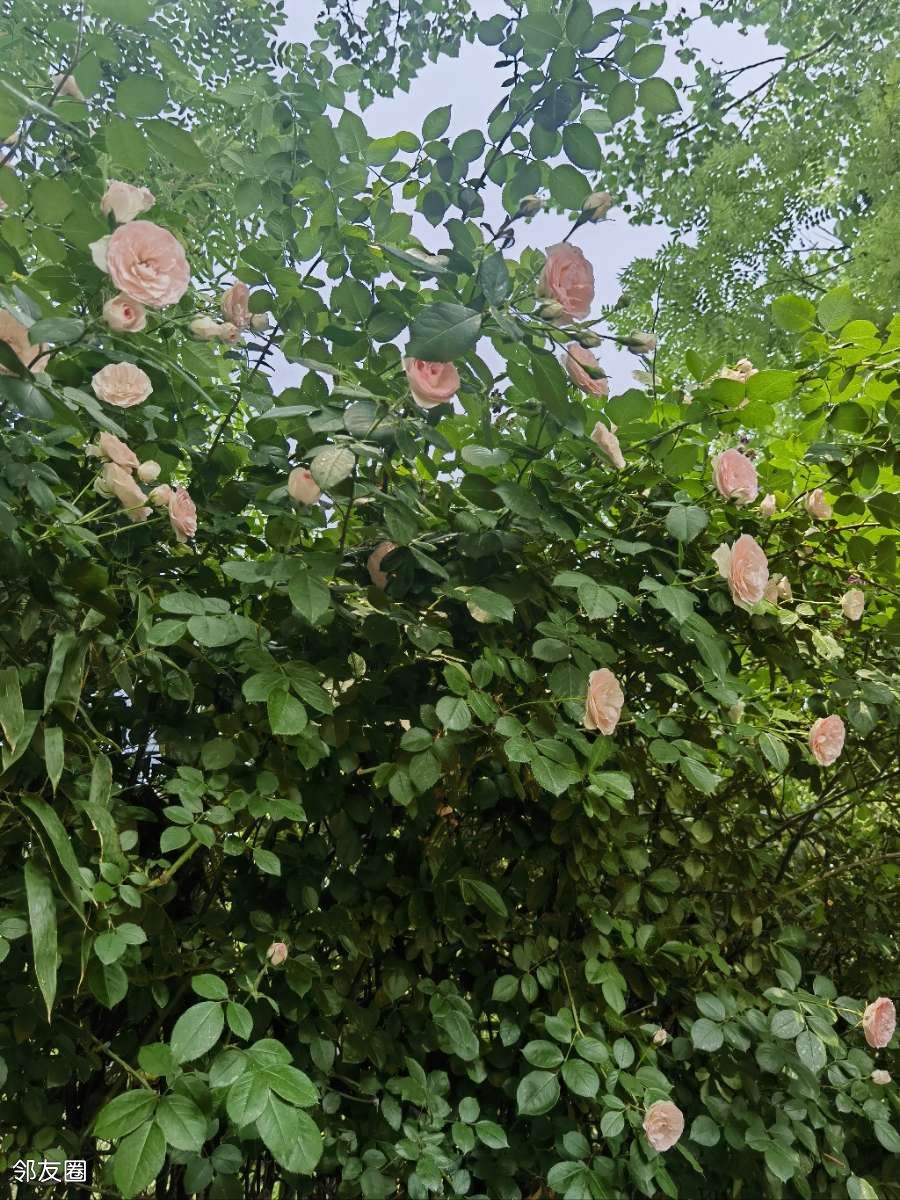 粉团蔷薇是野蔷薇的一个变种,别名红刺玫、华蔷薇等,蔷薇科蔷薇属攀援灌木。花期4至9月,果期9至10月。原产中国,广泛分布于包括北京在内的华北、华东、华南、西北广大地区,多生于山坡、灌丛或河边等处,甚至能在海拔1300米的高山区生长。粉团蔷薇的花瓣如丝绒般细腻,色彩丰富,从浅粉到淡桃,数种颜色交织融合在一起,仿佛是大自然的调色盘。暮春浅夏时节,将艳丽的花朵和悠远的清香同时奉献给人们,观赏价值极高。早在汉代就被种植,南北朝时期被推广,当时人们称为“买
