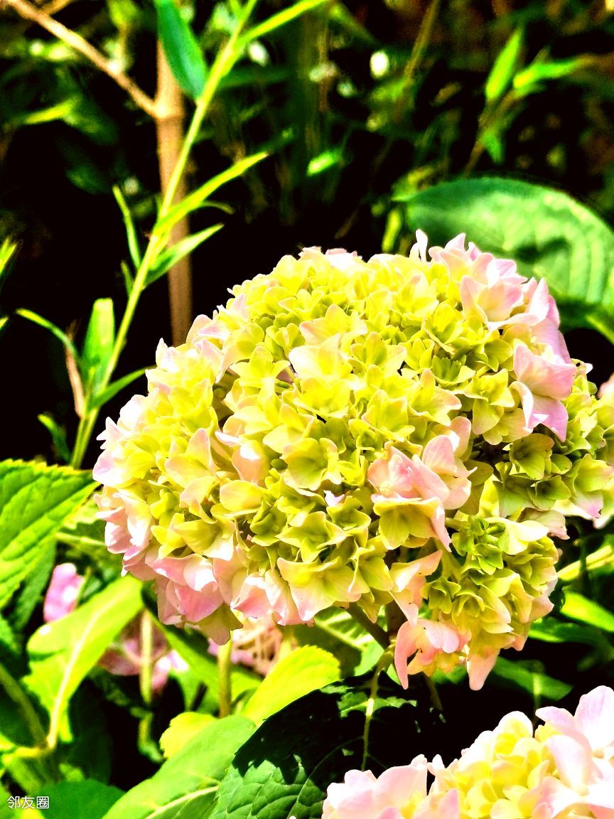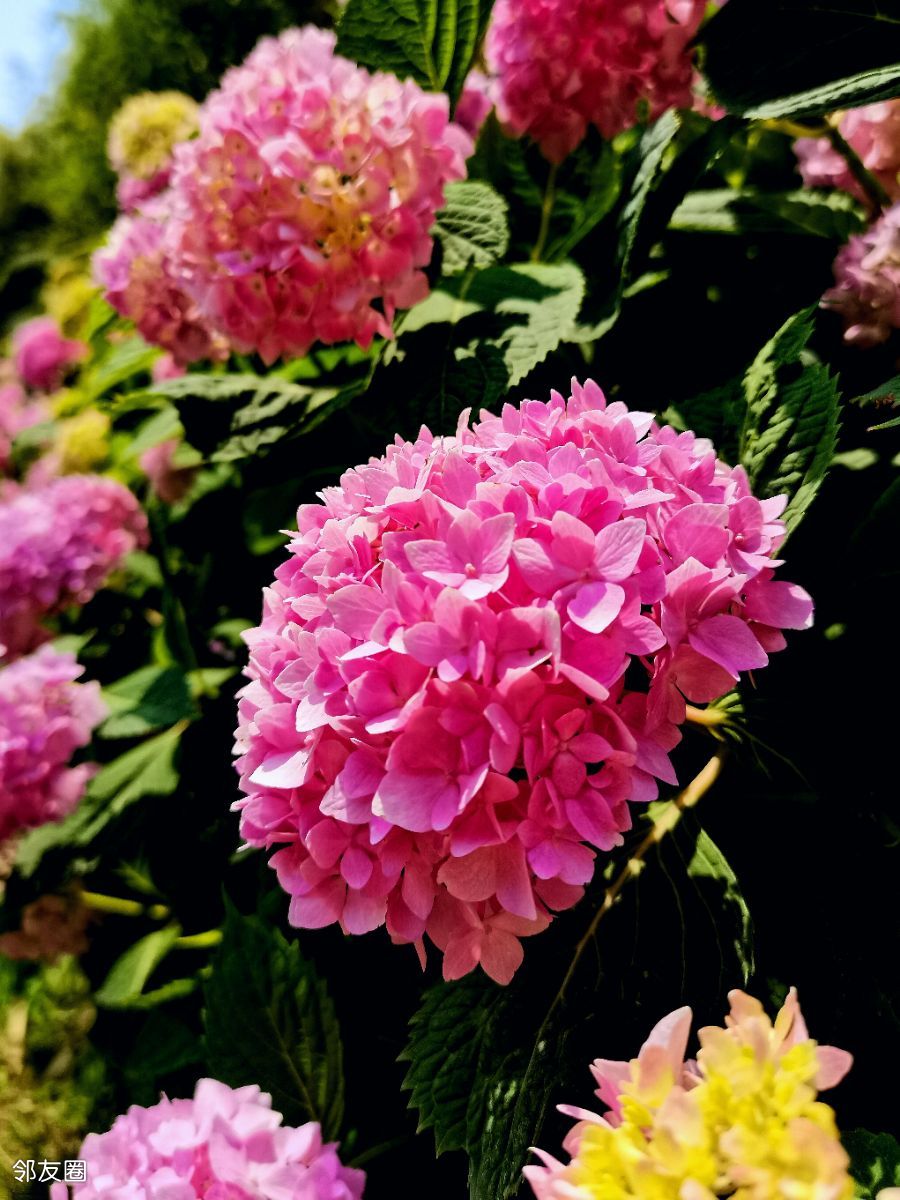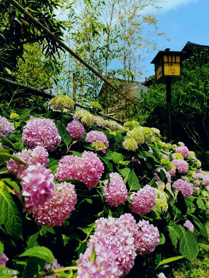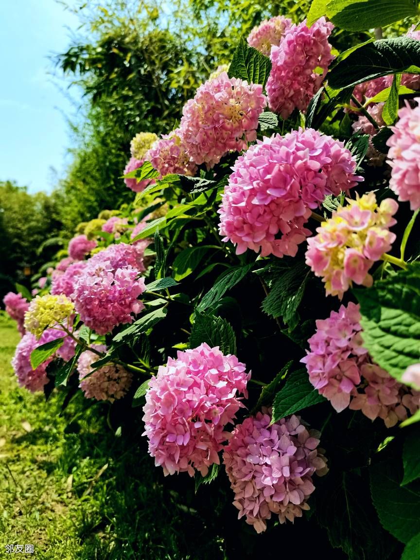 夏日的风掠过枝桠,绣球花便缀满了整片翠绿。一朵朵绣球如天边揉碎的云霞,悄然降临人间,团团簇簇地拥挤在枝头,宛如精致的丝绸花球。粉白的花瓣层层叠叠,似少女精心编织的裙摆,微微卷曲的边缘泛着柔和的光晕,朦胧间透着几分梦幻;靛蓝的绣球深邃如静谧的湖水,花瓣间流淌着神秘的幽光,仿佛藏着无尽的故事;淡紫的绣球则带着缱绻的诗意,氤氲着温柔的气息,像是被夕阳晕染的晚霞,美得令人心醉。