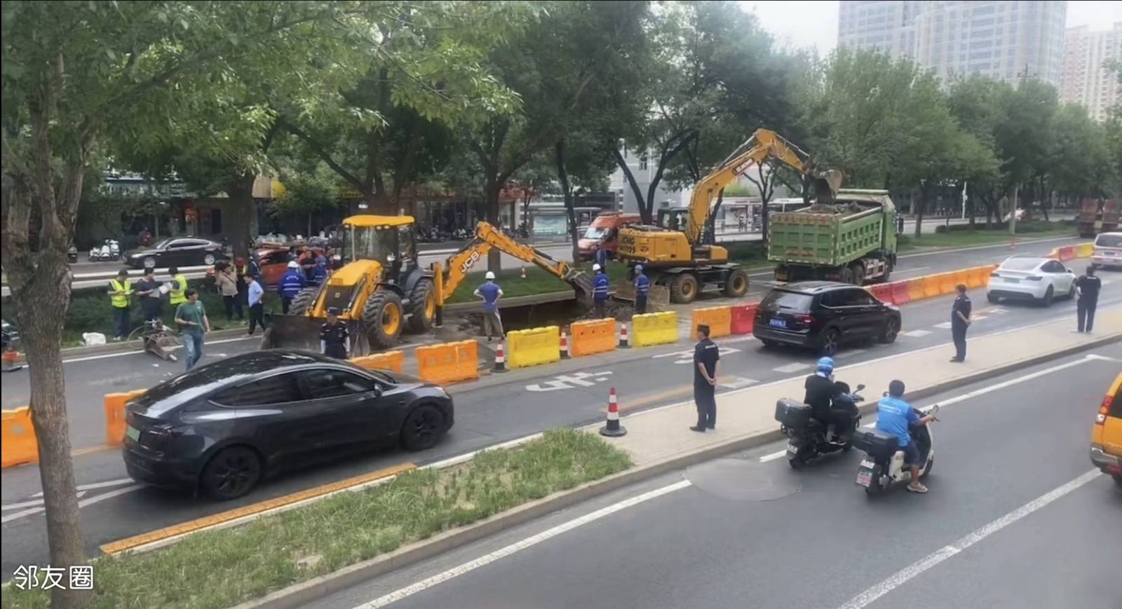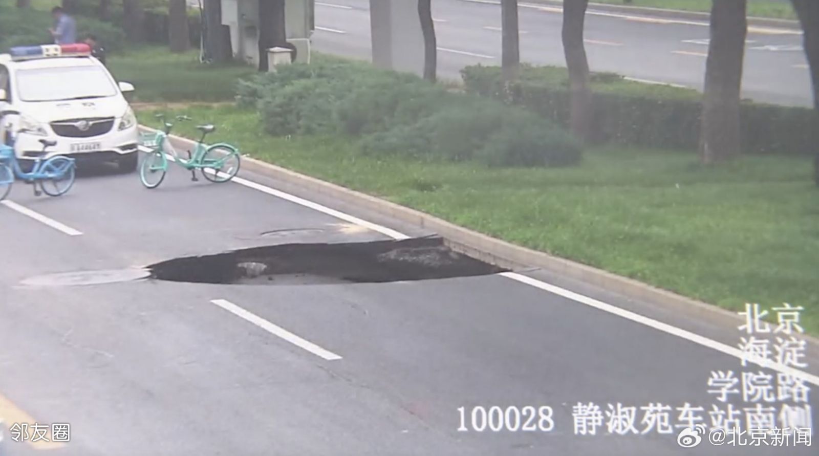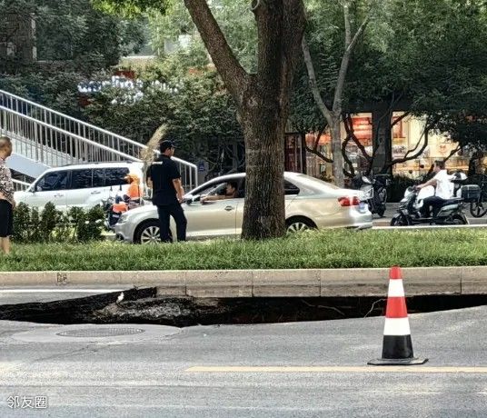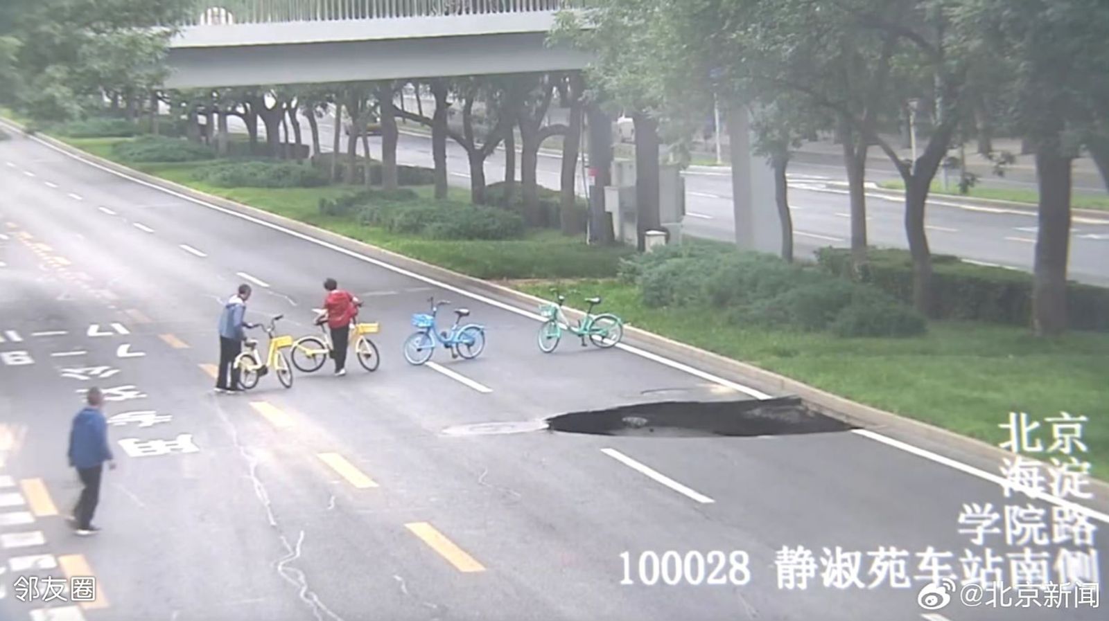 几位热心市民,挪来共享单车,隔开塌陷区,