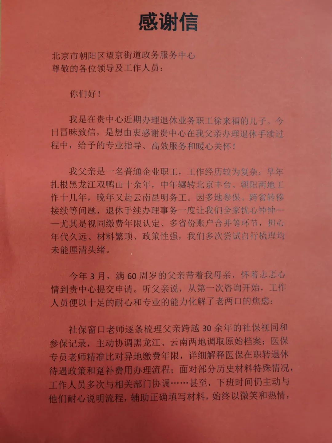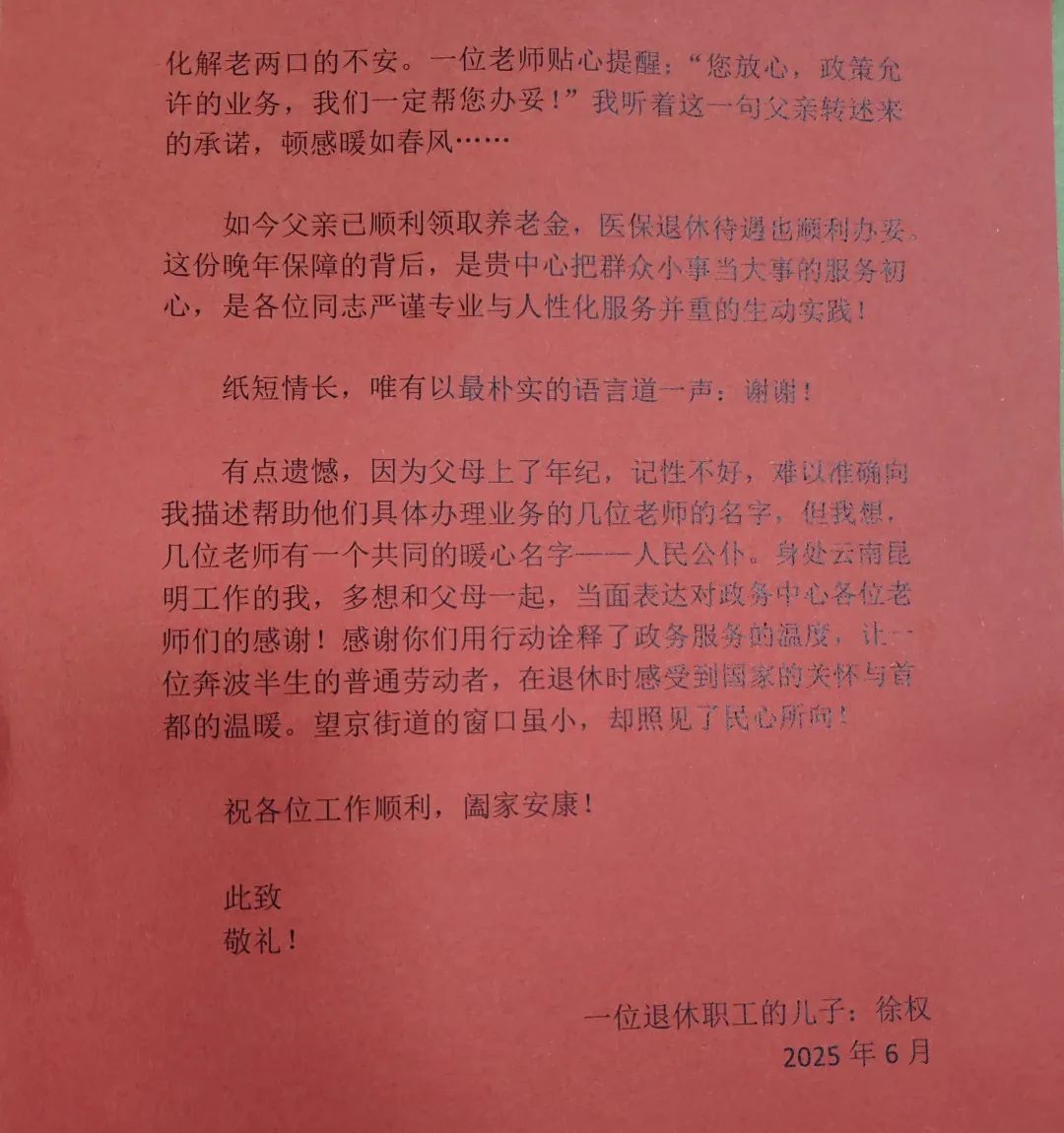 近日,两位年逾六十的老夫妻带着一面锦旗来到望京街道政务服务中心,随之而来的,还有一封来自云南昆明的感谢信。信中,退休职工徐来福的儿子徐权用朴实的语言,记录了父母在办理退休手续过程中,政务服务中心工作人员如何以“跨省接力”“延时服务”等暖心举措,化解了困扰全家的跨省参保难题。