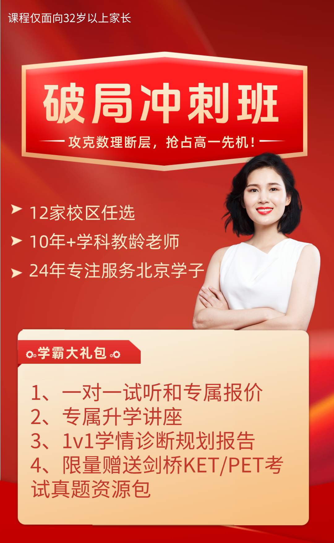 秉持“诚信为本,育人为先”的宗旨,24年专注北京小初高辅导,用专业和口碑帮助超过20万学子高效提分,每年输送400+清北学子!专业团队为孩子定制「目标-方法-习惯」三位一体提升方案!