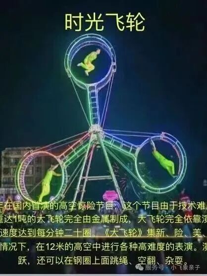 晚场:水上竹漂7点50分,环球飞车7点,魔幻飞轮7点30分,杂技马术8点10分