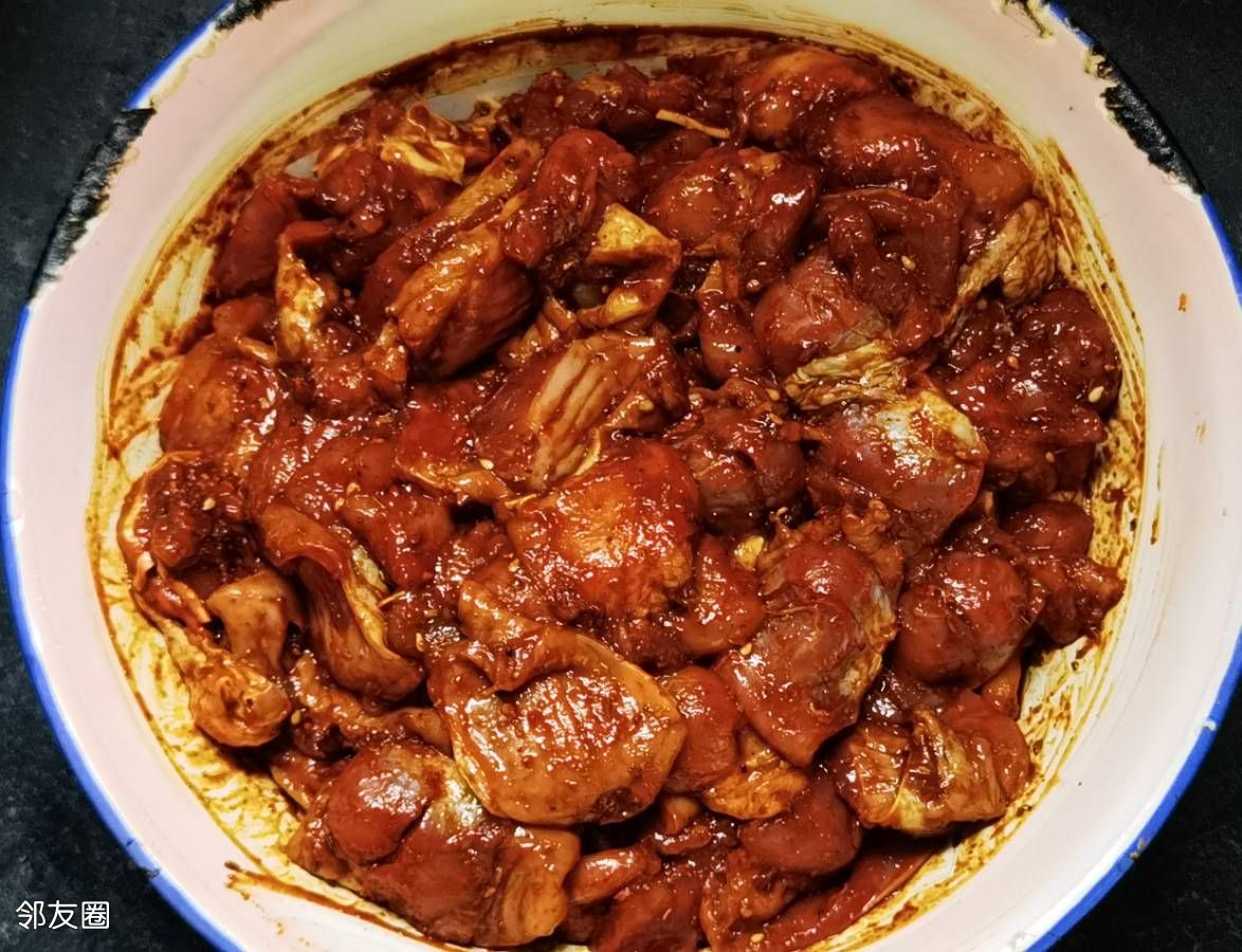 今早一大早七点来钟就奔了左家庄早市,买了俩鸡大腿并请摊主帮忙剔了骨,回家后把鸡大腿肉和鸡胗子冲洗干净切块,然后用调料腌制起来。然后我就出门耍去啦!