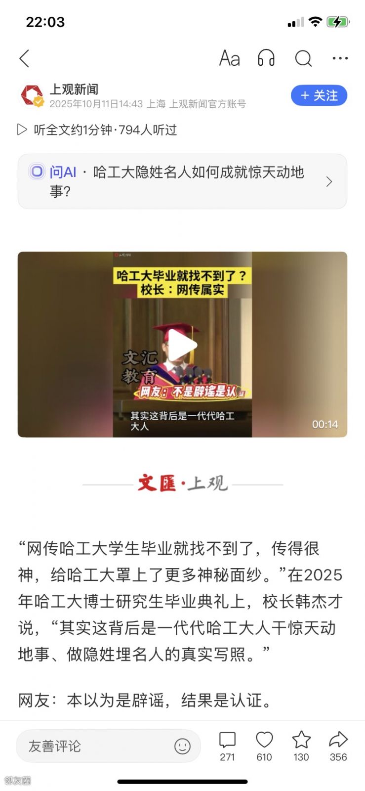 “网传哈工大学生毕业就找不到了,传得很神,给哈工大罩上了更多神秘面纱。”在2025年哈工大博士研究生毕业典礼上,校长韩杰才说,“其实这背后是一代代哈工大人干惊天动地事、做隐姓埋名人的真实写照。”