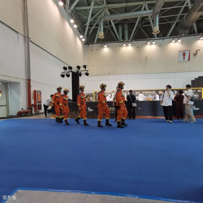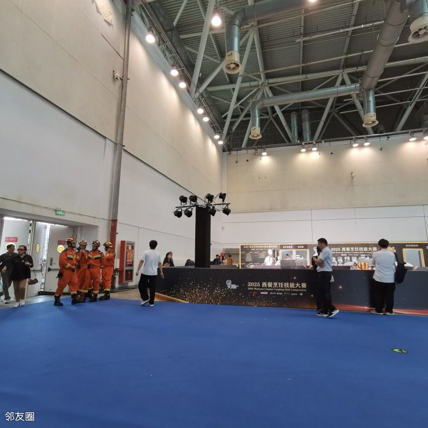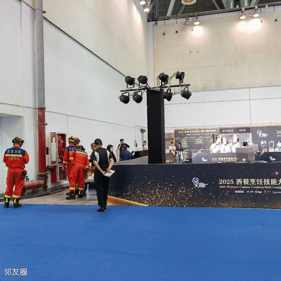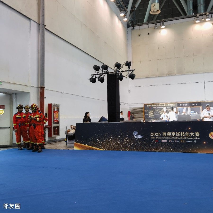 在苏州参加西餐厨艺大赛,消防在展馆里每半小时巡视一遍。