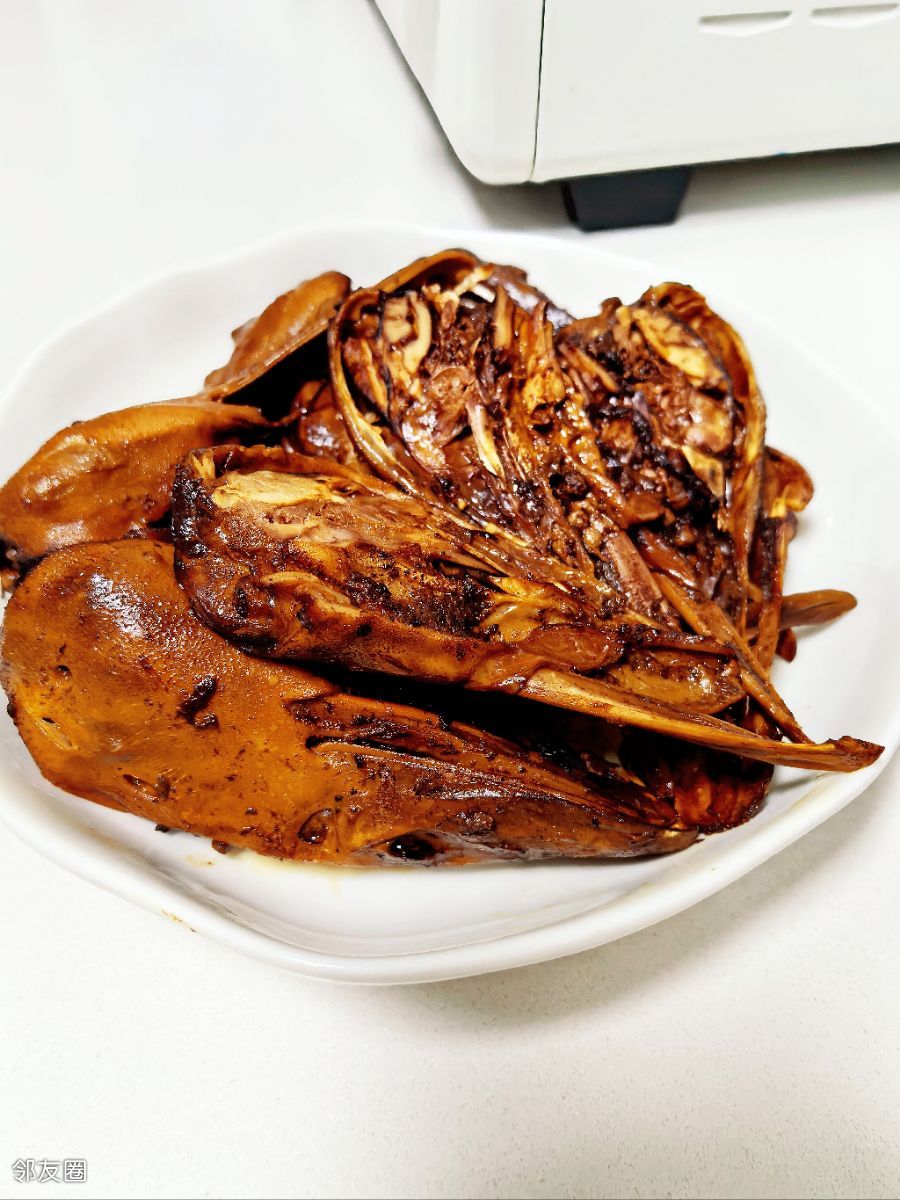 昨天卤的鸭头,今天切开空气炸锅,稍微烤了烤