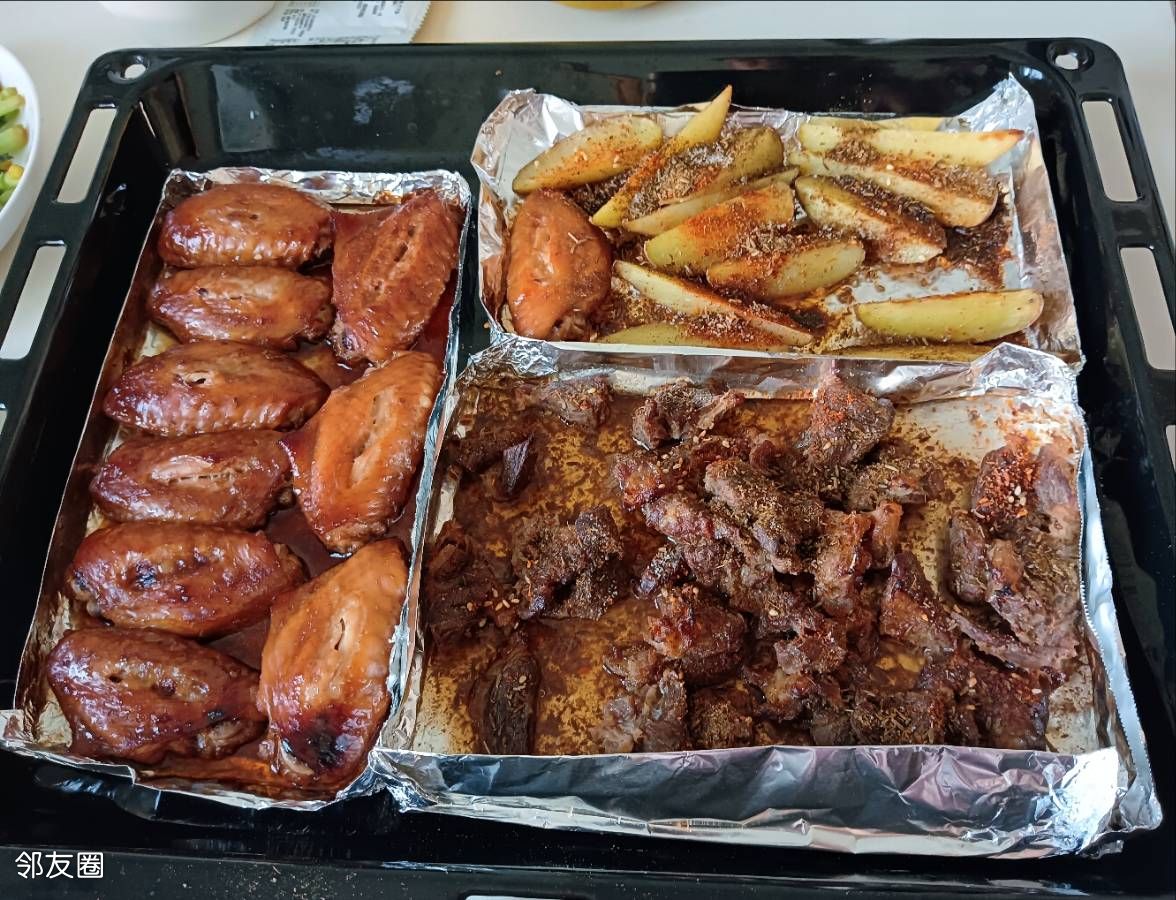 今天是星期六,周末午餐做的烤肉、水煮鱼,还有大虾、三文鱼刺身和披萨。