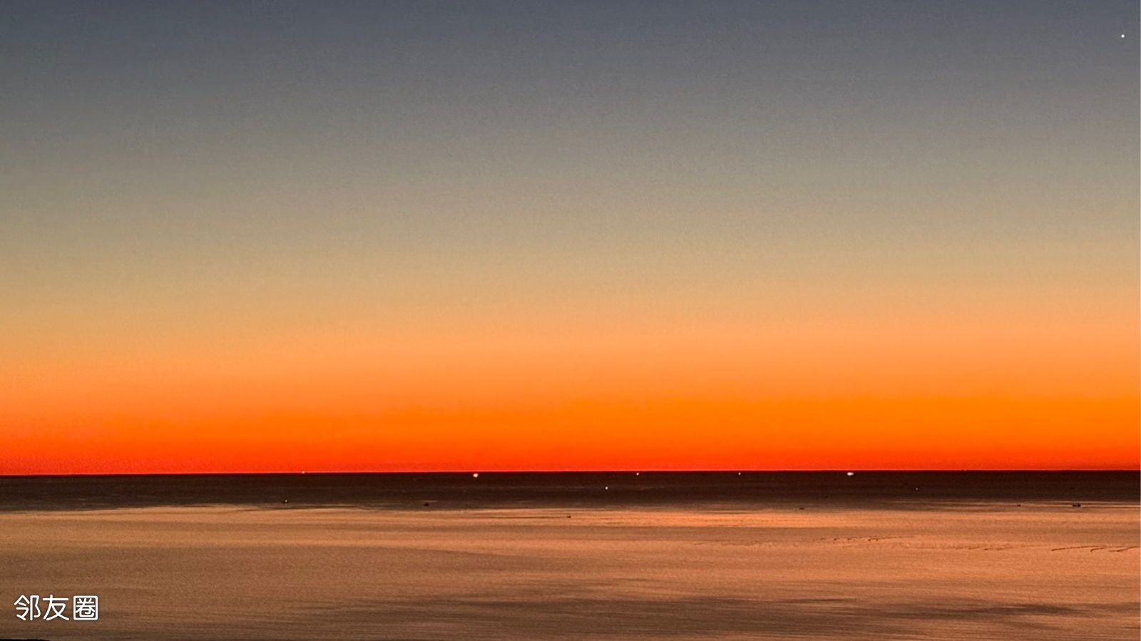 一线天!漫天红霞,仅有海岸线划出了一线天。