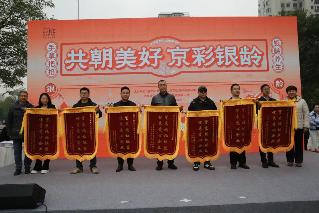 朝阳区民政局副局长肖志锋、望京街道二级调研员张宝会向寸草春晖、四季千尺、福寿苑、金百万、橙医健康、北控社区食堂、美鑫旺京护理7家单位授予了“望京福祉联盟优秀爱心企业”锦旗。