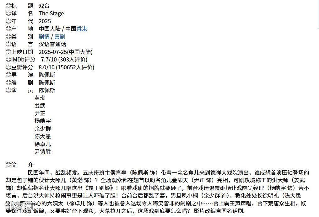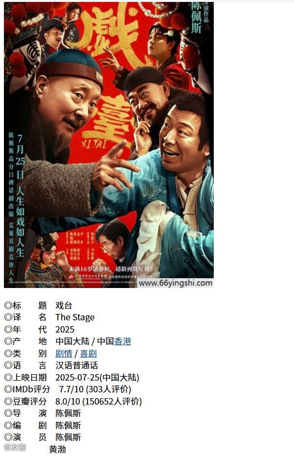 陈佩斯根据同名话剧改编的电影【戏台】已经在电影港(www.dygang.com)开放下载。该片豆瓣评分为8。