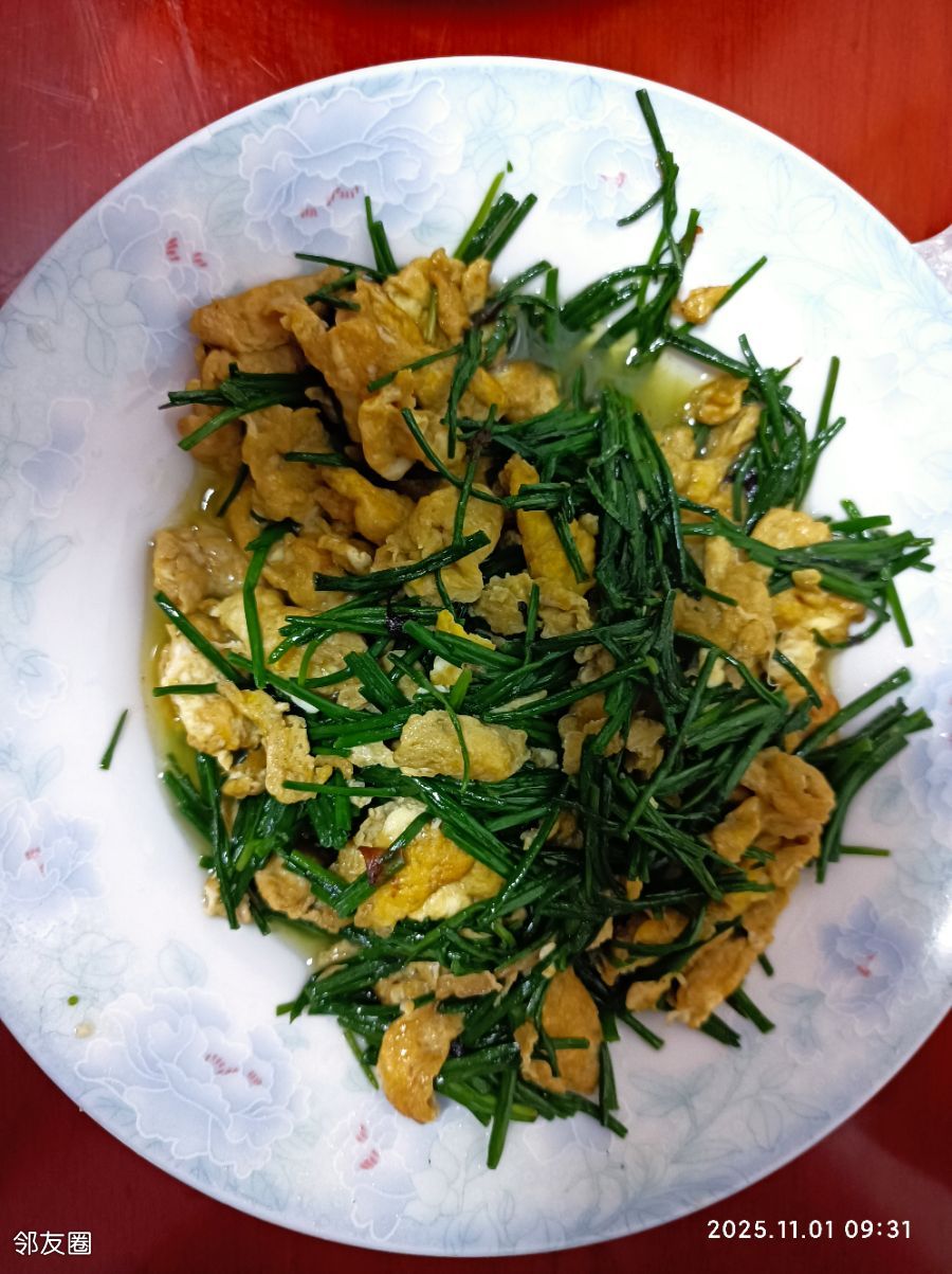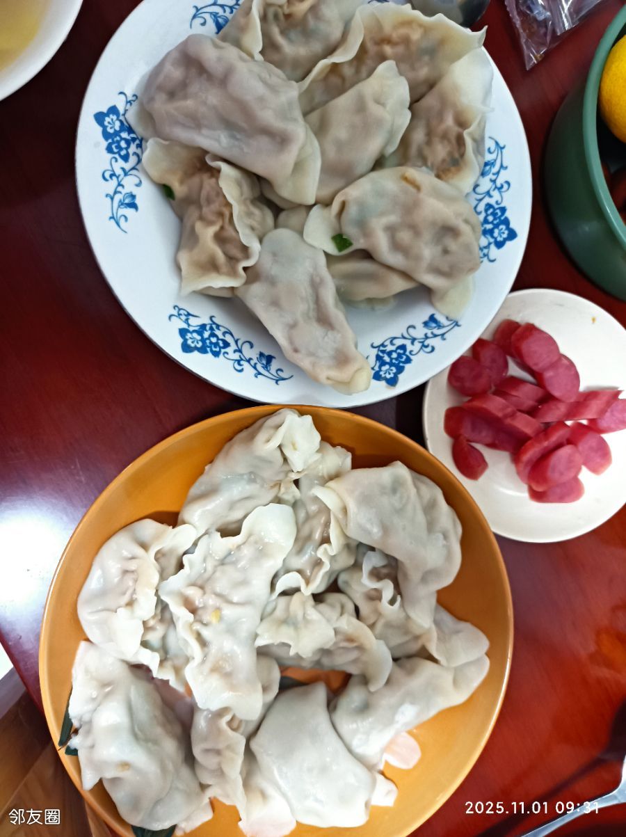 沙葱炒鸡蛋,白菜鱼丸汤,猪肉虾仁白菜韭菜馅儿饺子。还挺舒服