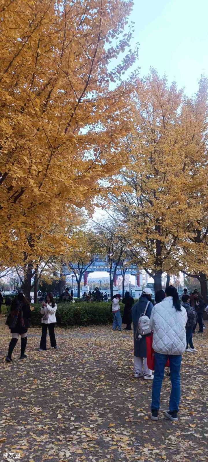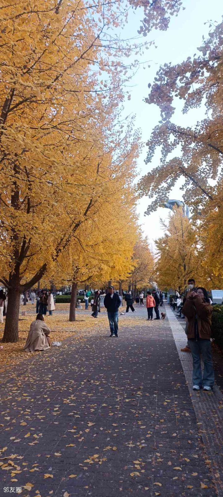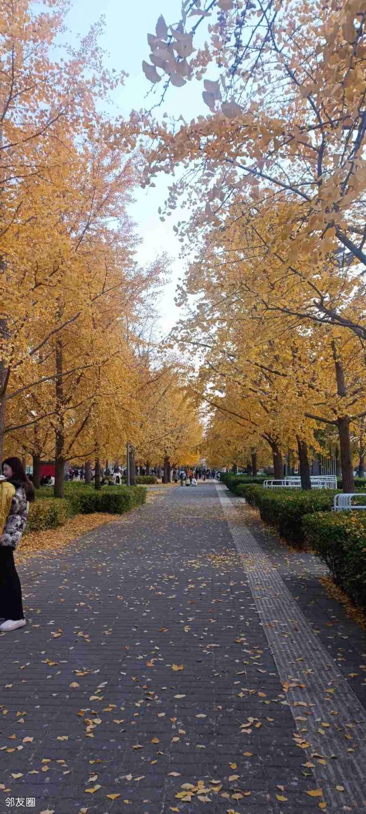 道路两侧的银杏叶已染成浓郁的金黄色,落叶铺在路面形成“金色地毯”,搭配高大的树木,形成了开阔又温暖的秋景长廊。
