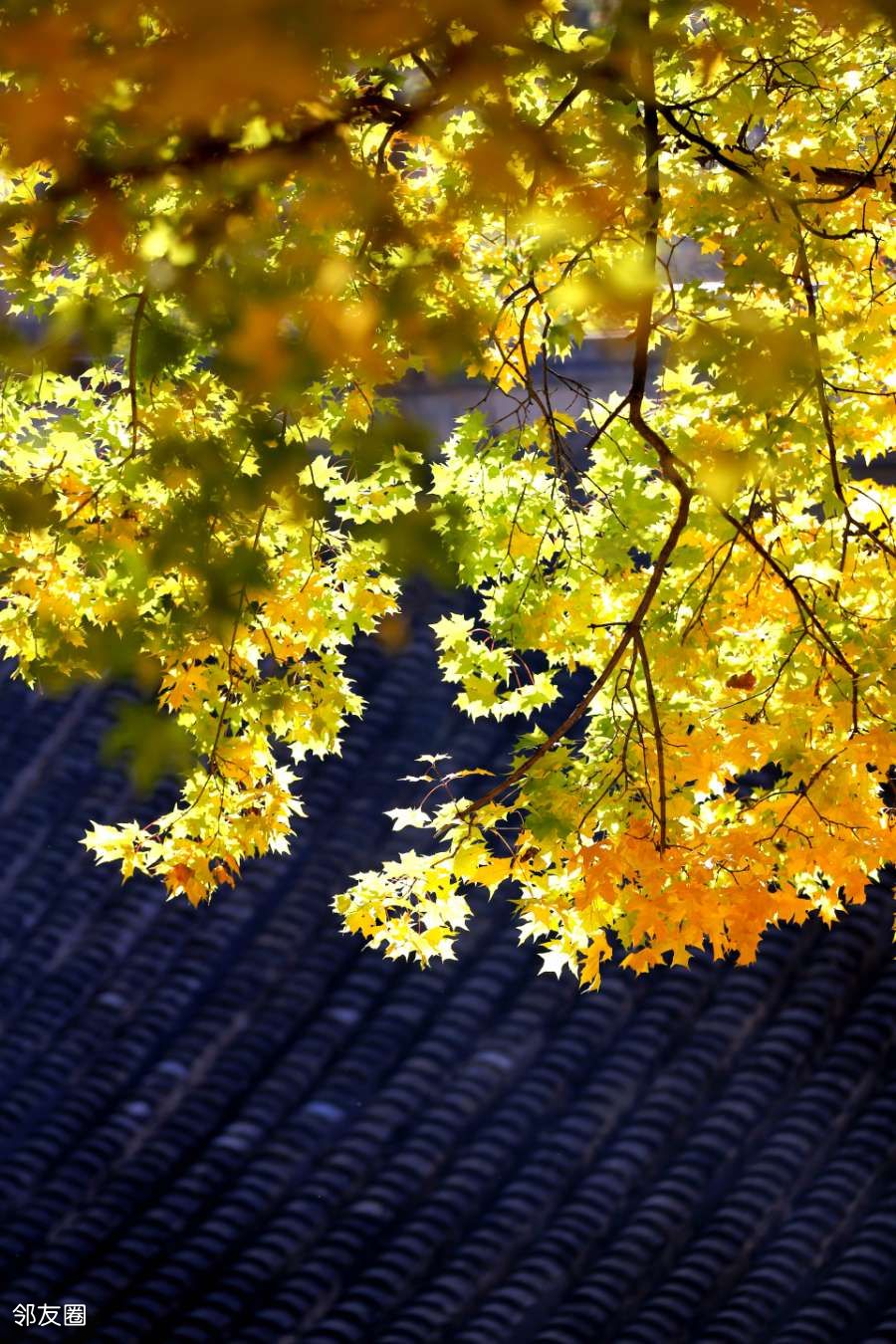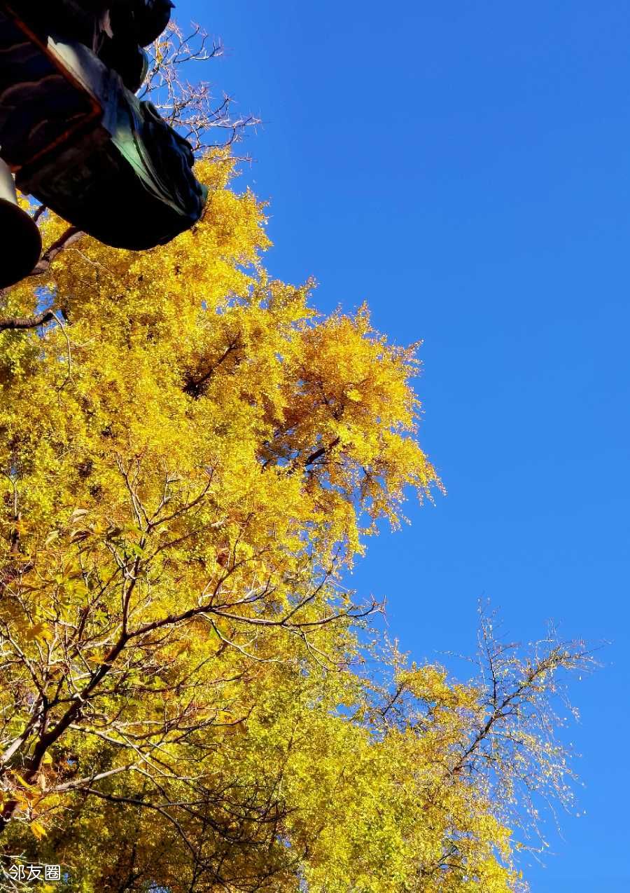 金黄的叶片簌簌飘落,在古殿前铺成圆满。每片叶子旋落时,都像在诉说一个轮回。阳光透过枝叶缝隙,洒下斑驳光影,游客走过,衣袂带起几片落叶,又轻轻落下。