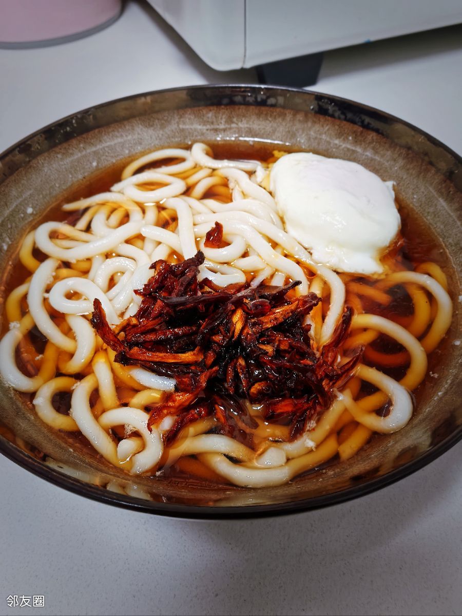 乌冬面:菌菇酱,榨菜,溏心蛋