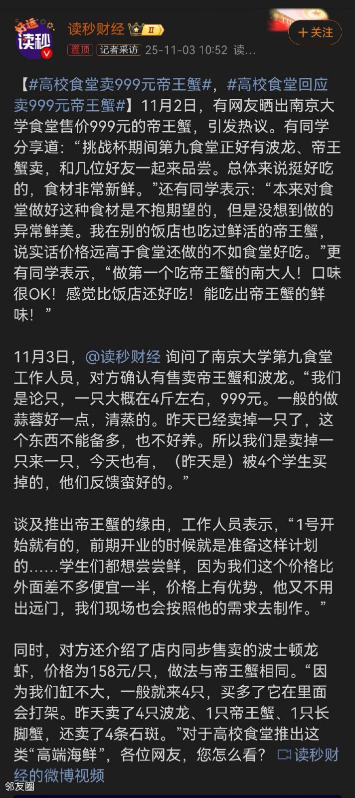 高校食堂开始卖帝王蟹了?999元一只