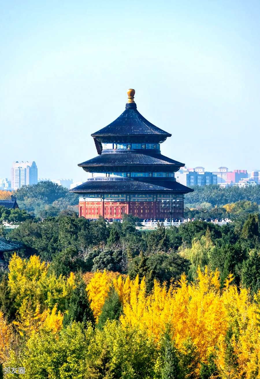 秋风的晕染,使大道两旁银杏树逐渐褪去翠绿、换上金衣,夹杂其中的古柏依然苍翠,宫墙护卫的祈年殿矗立在大道尽头,庄严肃穆。阳光洒下,呈现在人们眼前的,是一幅金黄、翠绿、宫红、湛蓝交织的诗意画卷。