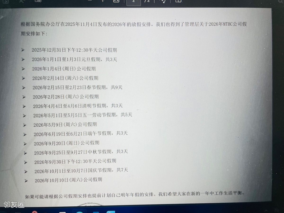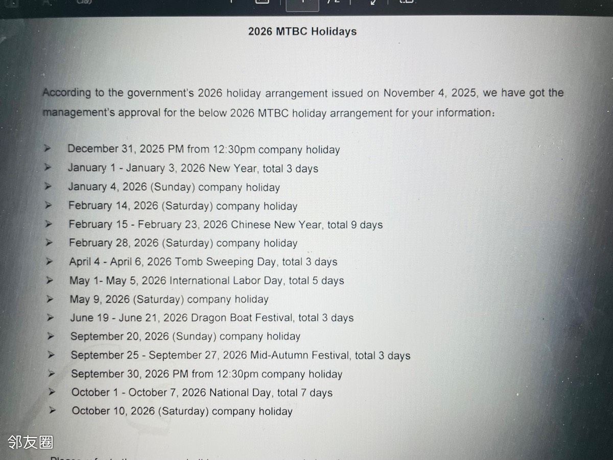 公司人事刚公布明年休假安排,似乎换了个英国老板,休假安排也大方了些