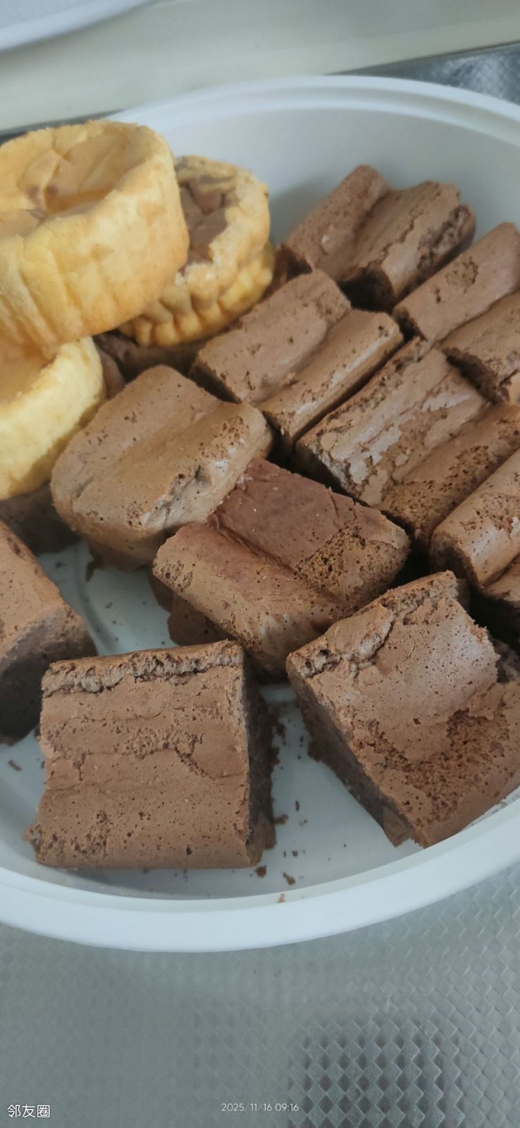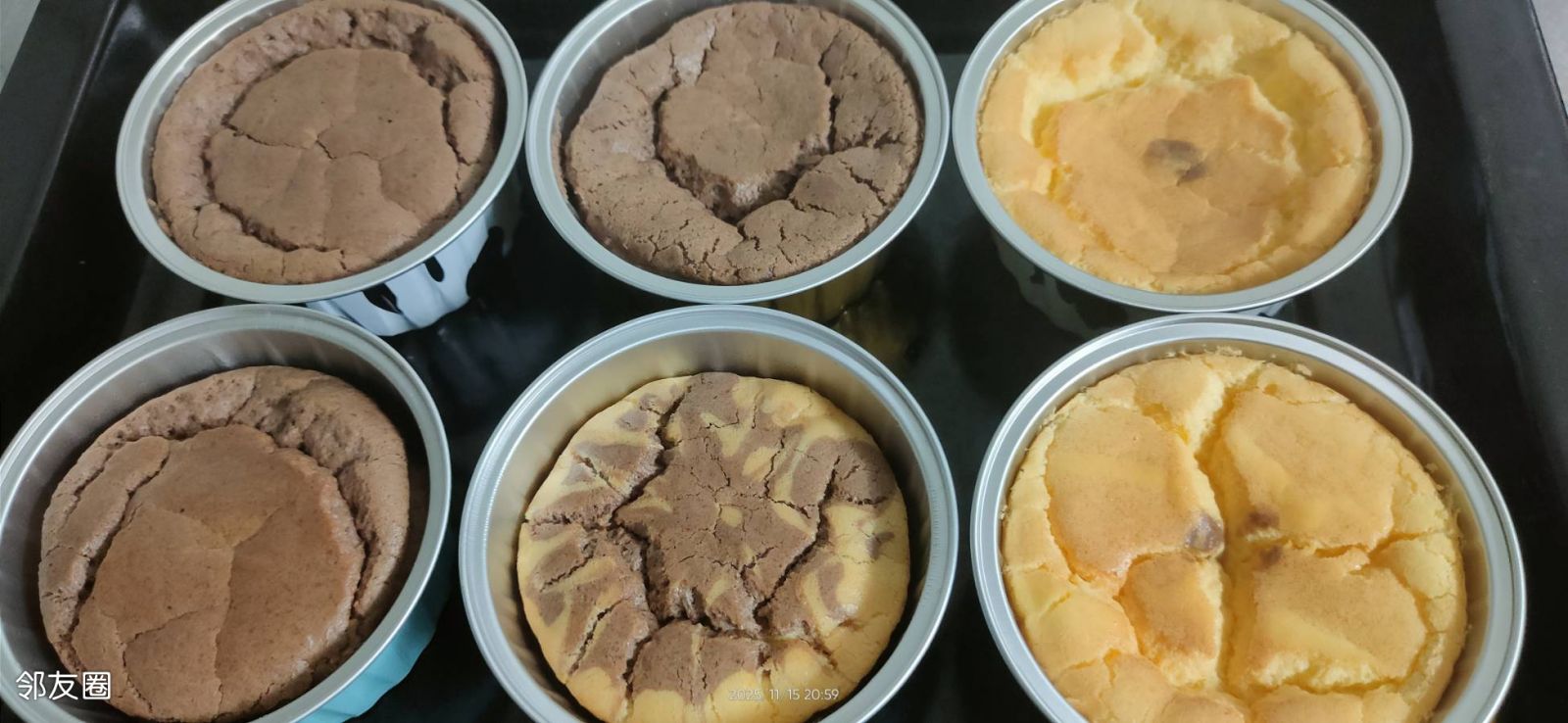 昨晚饭后烤好的,倒扣,没等晾凉就睡觉了。今早才脱模。另一半加了可可粉的搅拌时消泡了。昨天蛋糕糊比预期多,赶紧找出几个小模具救场。