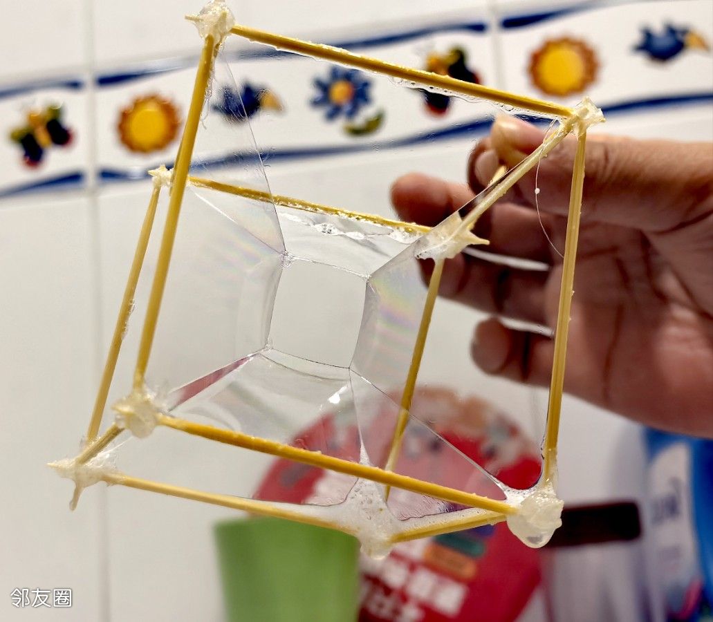 今天抽出了半小时的时间,找了个小实验,用热熔胶和牙签粘了个立方体的图形,再用洗衣液和洗衣粉混合液配一盒子水搅拌成泡泡液,把牙签立方体泡进泡泡液,提出来一看,果然一个传说中的多维体造型诞生了!