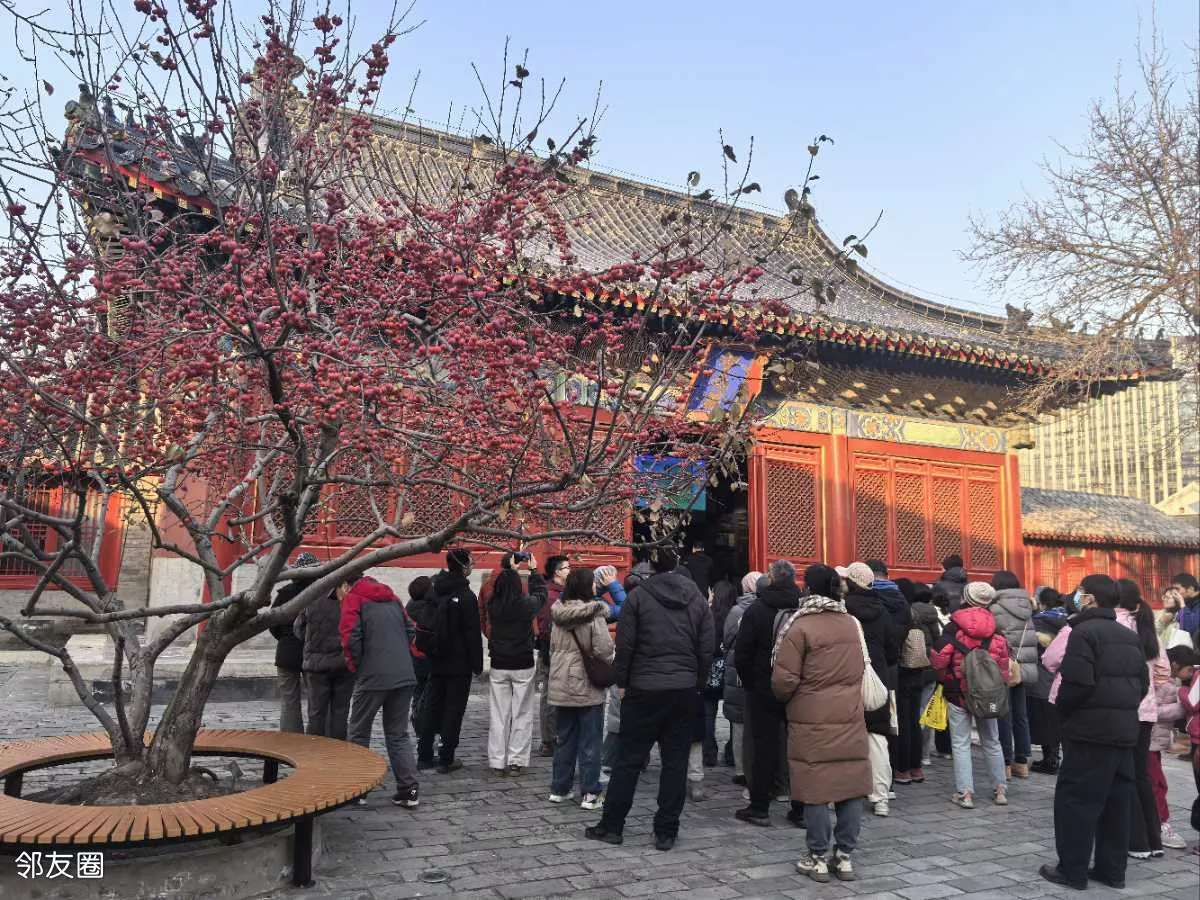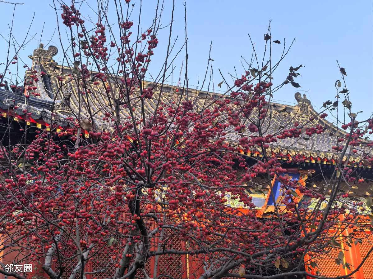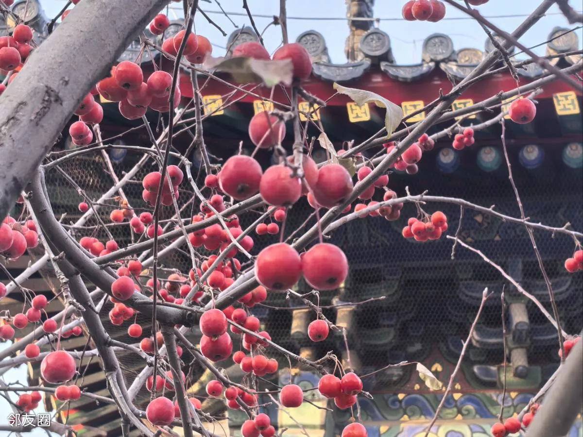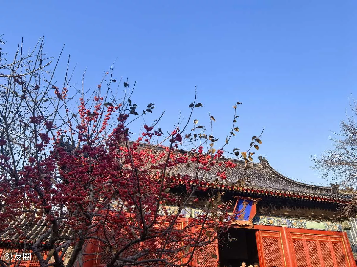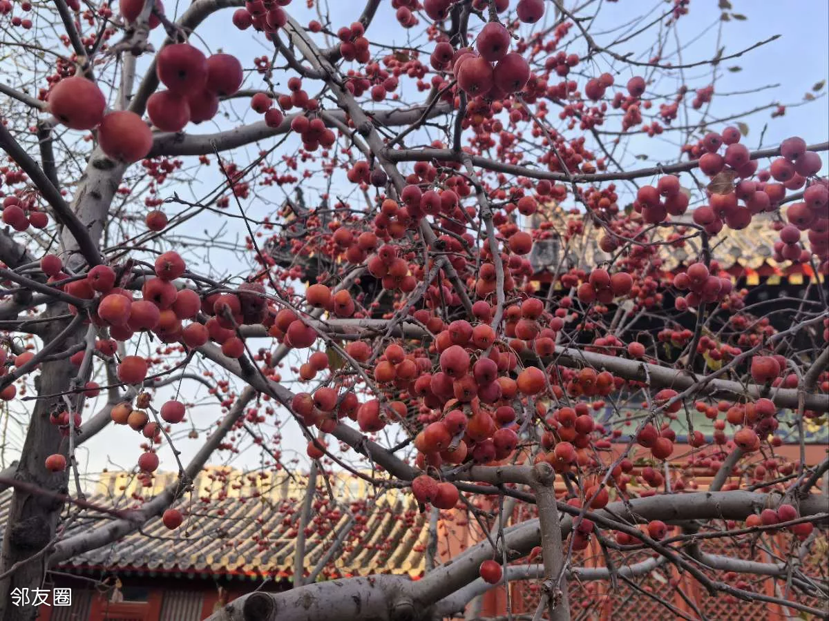 进入寺内见一群游客正围着讲解员听的津津有味,我们也边听边跟着往里走,走过智化门便见到智化殿右前侧的海棠树上一串串挂满枝头,红艳欲滴,好看极了!引得游客们反复上下左右地拍个不停。初以后是假的,后上前细看发现是真的!成了寺内的网红打卡果了!