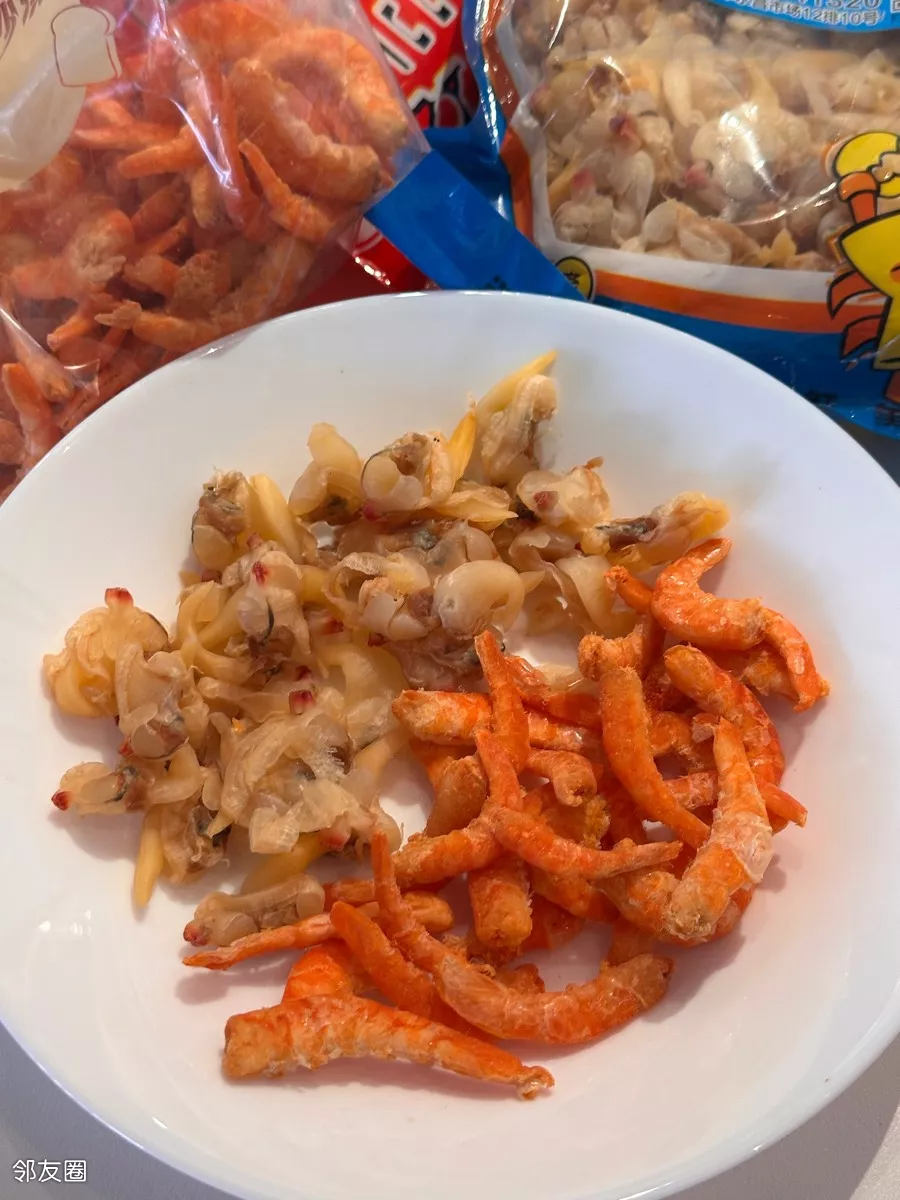 我姨在塘沽,干海货都自己做,给我的虾干我就当零嘴吃。