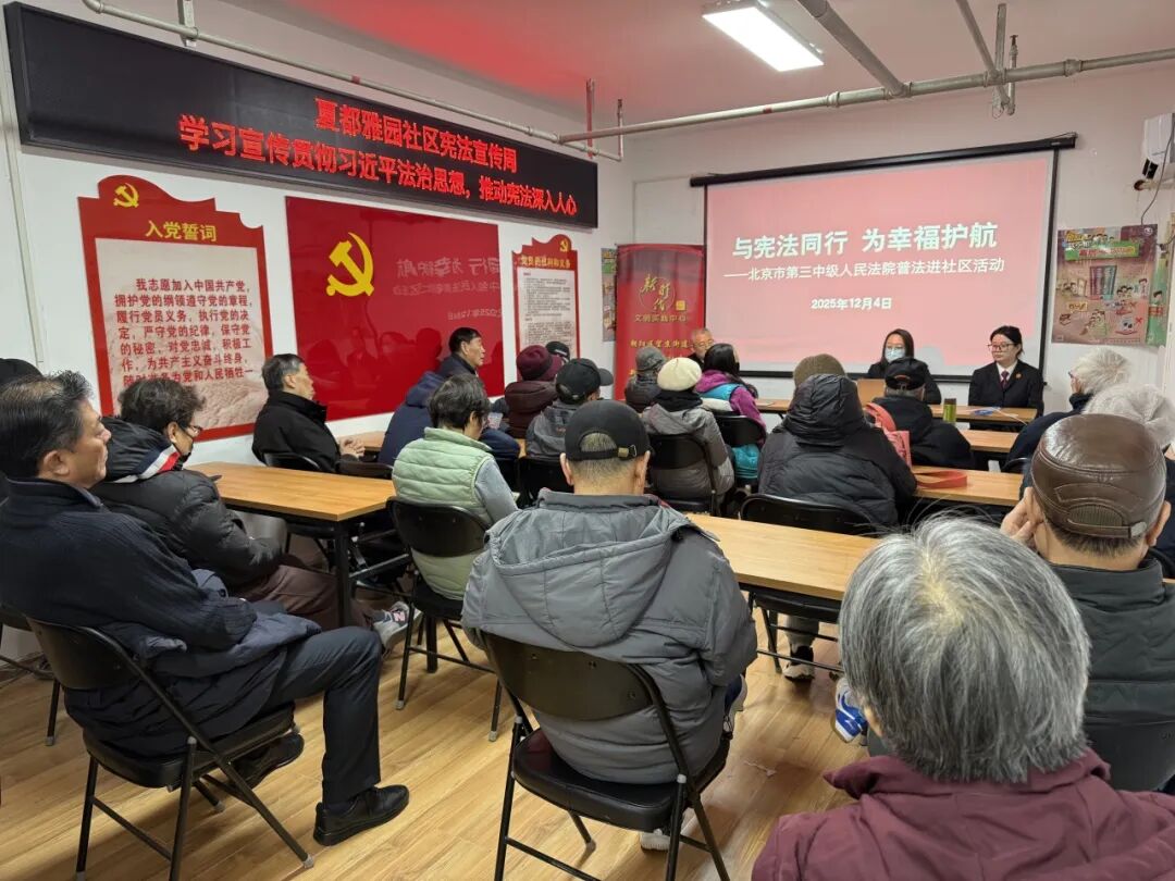 夏都雅园社区邀请北京市三中院民三庭开展“与宪法同行,为幸福护航”普法进社区活动。法官们用“家常话”解读法律条文,结合真实案例向广大党员普及法律知识。互动咨询环节,针对居民关注的婚姻家庭、财产继承等法律问题,耐心答疑解惑。本次活动有效打破了宪法知识的“专业壁垒”,提升了居民的宪法意识和依法维权意识,为社区法治氛围筑牢了群众基础。