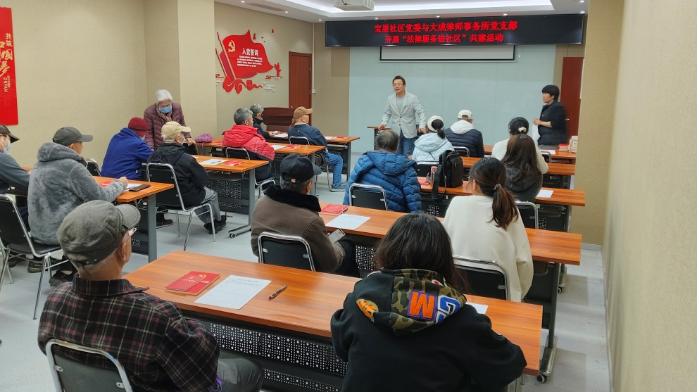 宝星社区联合北京大成律师事务所开展“法律服务进社区”共建活动,对宪法和习近平法治思想进行宣读学习。律师一对一为居民提供免费法律咨询服务,涉及遗产继承、赔偿诉讼、房产纠纷、遗产托管等居民最关心的生活问题。