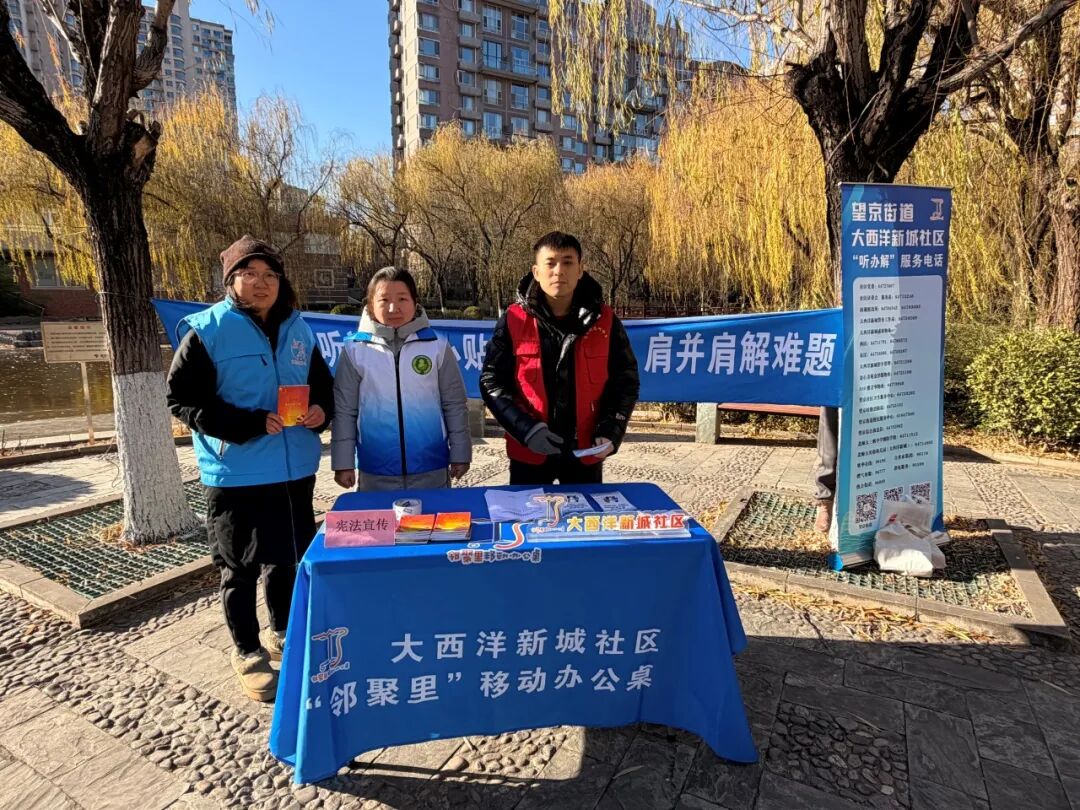 大西洋新城社区依托“移动办公桌”走进中心湖广场,主动收集居民诉求,将“收集诉求”与“普及宪法知识”有机结合,打造双向互动的普法阵地。同时,工作人员还为居民发放宪法宣传手册,重点围绕习近平法治思想、党的二十届四中全会精神、宪法的规定原则和精神等内容,向居民悉心解答诉求。