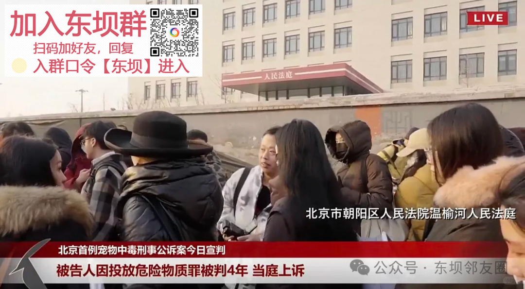 东坝的家人们!是否还记得曾发生在畅颐园小区的宠物投毒案?时隔近3年2个月,北京首例宠物中毒刑事诉讼案于今天(12月11日)一审宣判。被告张某某因投放危险物质罪被判有期徒刑4年,被告当庭上诉。