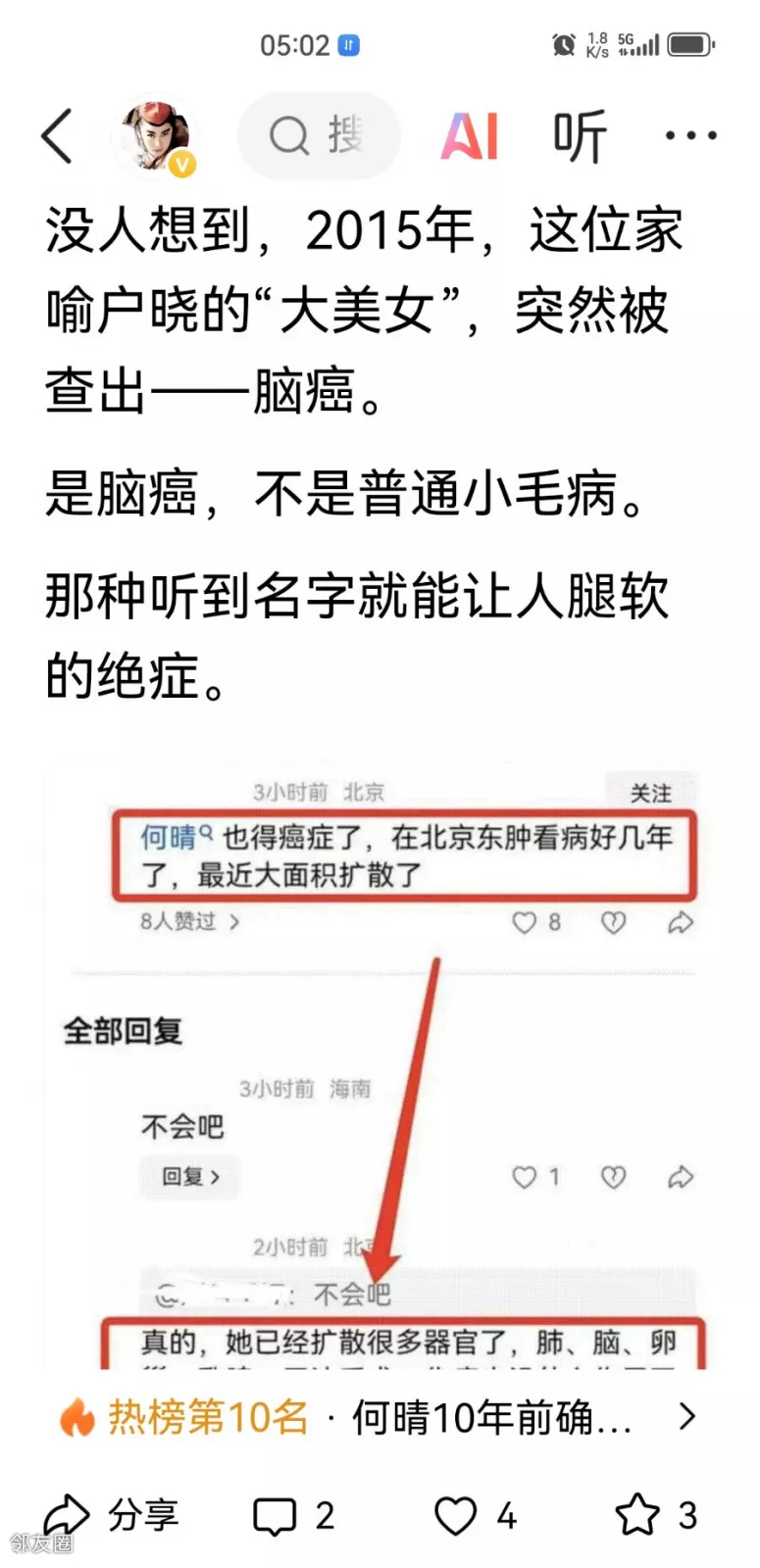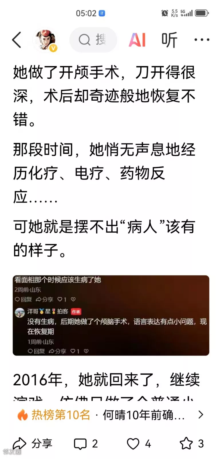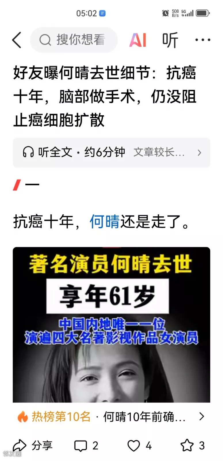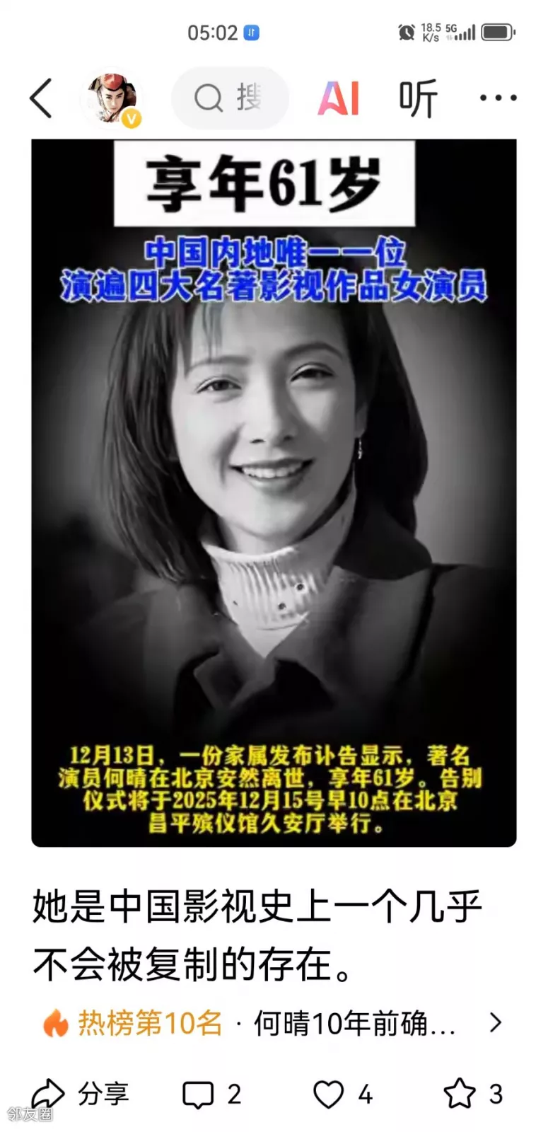 好友曝何晴去世细节:抗癌十年,脑部做手术,仍没阻止癌细胞扩散