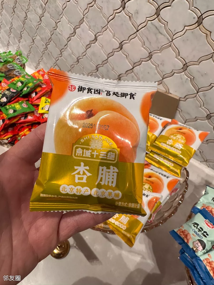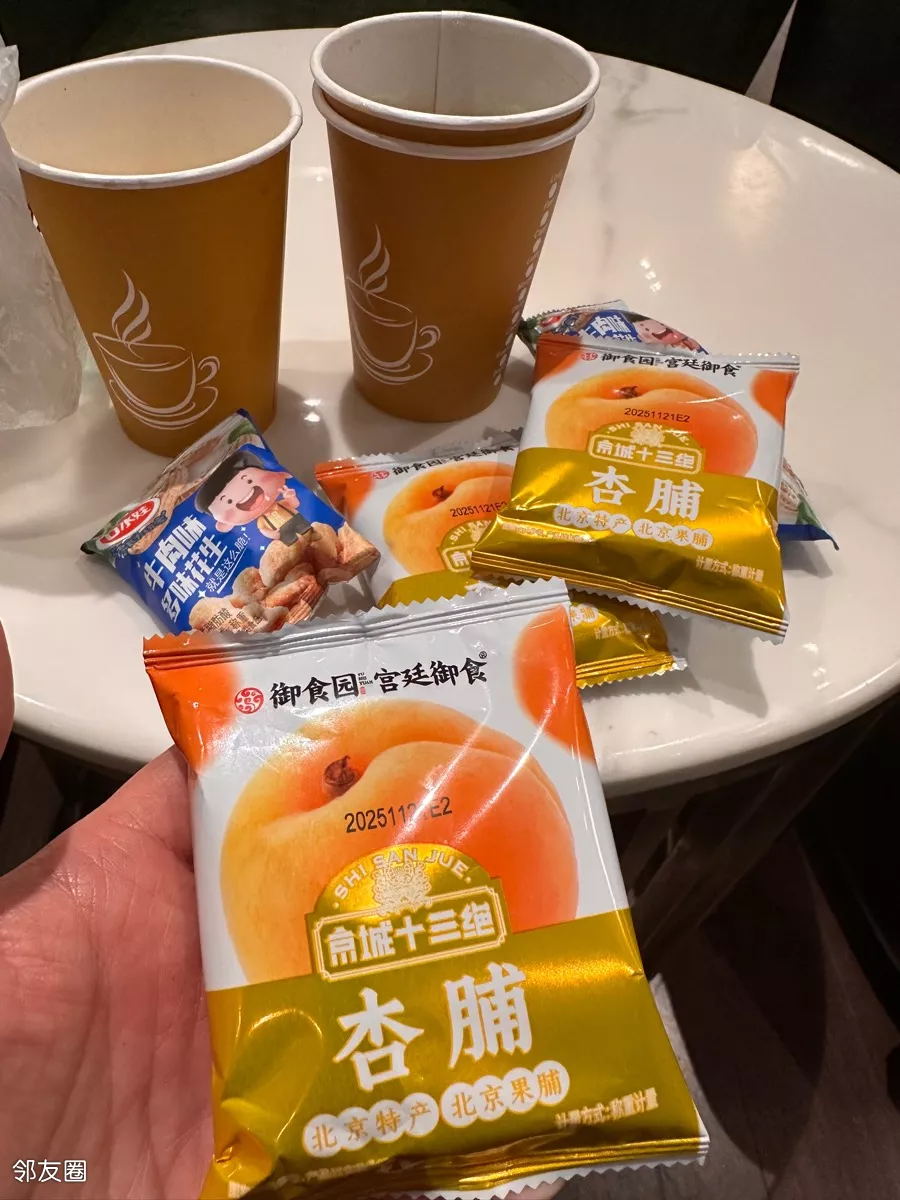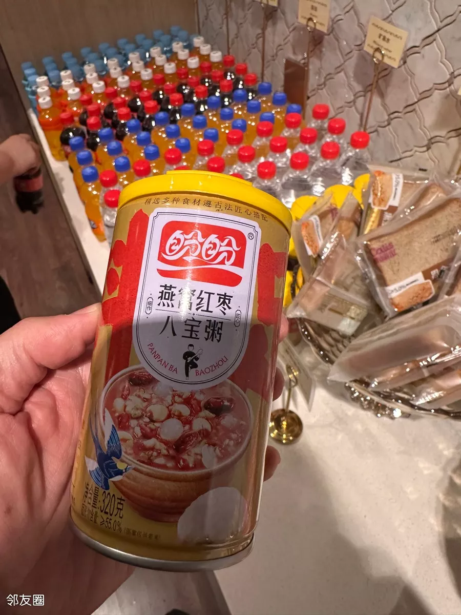 拿了一个八宝粥、五袋怪味豆、五包杏脯开开胃