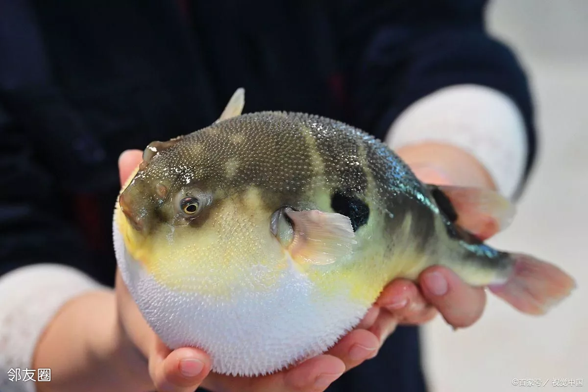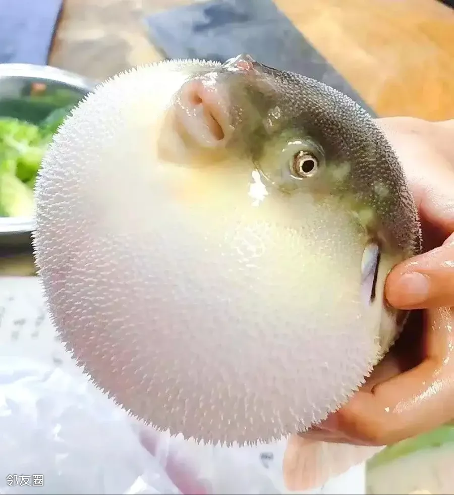 圆滚滚的球状。这种突然的体型变化让捕食者难以吞咽,同时体表的棘刺在皮肤拉伸下直立起来,形成物理屏障,增加捕食者的攻击难度。