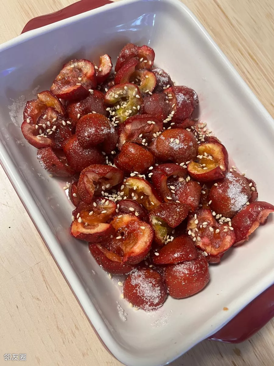 家门口奶皮子糖葫芦都26一串了,去早市时候挑了几个新鲜的山楂果子只花了1块钱,做了一碗山楂,去核后撒白砂糖微波炉4分钟,撒一些芝麻即可,户外凉了放在密封罐里面可以吃好几天。