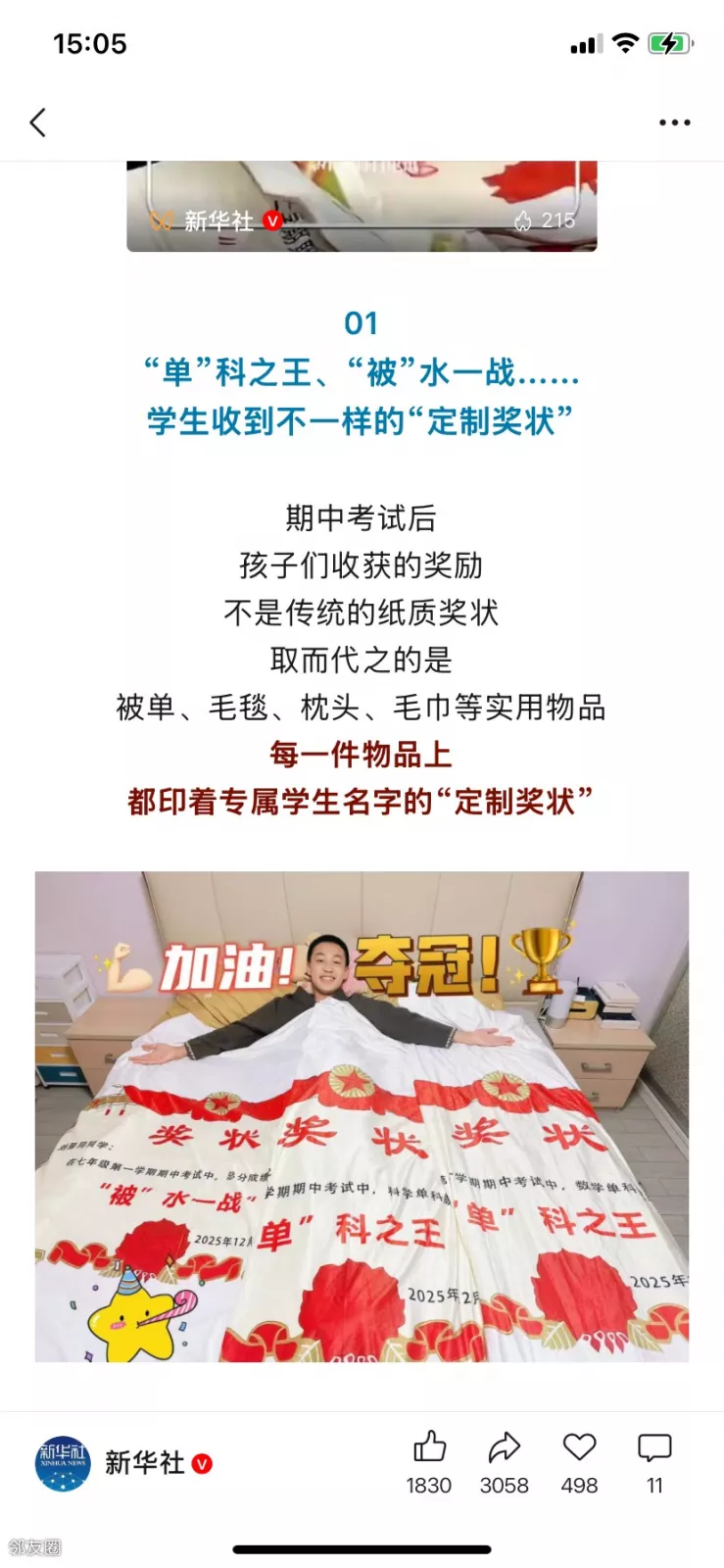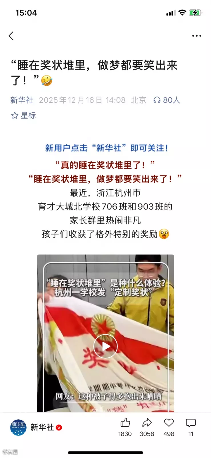 “真的睡在奖状堆里了!”“睡在奖状堆里,做梦都要笑出来了!”最近,浙江杭州市育才大城北学校706班和903班的家长群里热闹非凡孩子们收获了格外特别的奖励