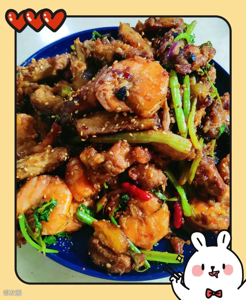 熊儿摔了之后,依然没忘问晚上吃啥?看来还行,不严重。那就弄点好吃的吧,何以解忧唯有美食,干锅鸡翅虾走起。配菜:洋葱、香芹、土豆,土豆、鸡翅和虾处理好,薄裹一层淀粉,榨至金黄,控下油。调个自制干锅酱,然后,放少许油,把炸好的东西和切好的菜倒入,用秘制干锅酱炒匀,入味后,撒芝麻,出锅,干饭!